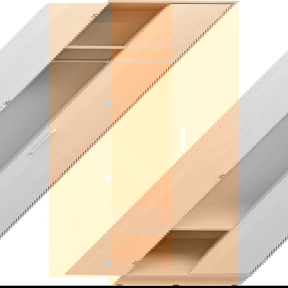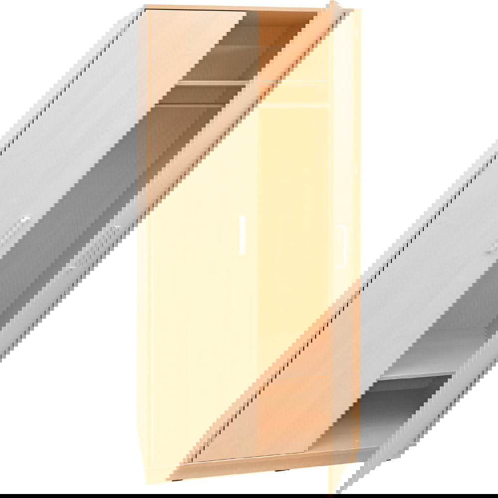 Das Innenleben dieses stabilen Schranks ist intelligent aufgeteilt: Eine mittige Trennwand separiert den Raum in zwei funktionale Bereiche. Auf der rechten Seite finden lange Kleidungsstücke an einer robusten Kleiderstange ihren Platz, darüber bietet ein festes Ablagefach Raum für Hüte oder selten genutzte Dinge. Die linke Seite ist mit vier Einlegeböden ausgestattet, von denen der obere und untere flexibel in der Höhe verstellt werden können. So lässt sich der Stauraum individuell anpassen – egal ob für dicke Winterpullover oder flache Ablagen. Das zeitlose Design in natürlicher Birke-Optik fügt sich harmonisch in jede Umgebung ein und schafft eine aufgeräumte, professionelle Atmosphäre.
