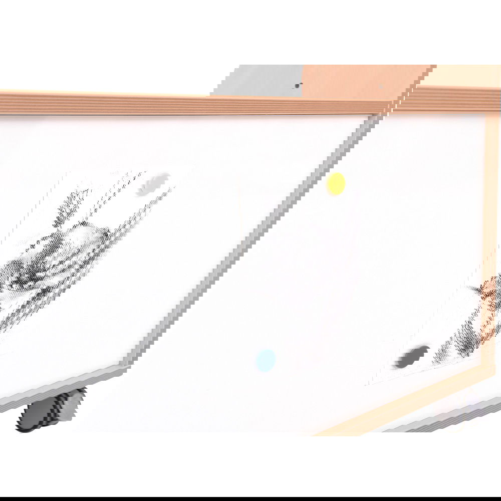 Auf der Vorderseite bietet das Regal mit einem verstellbaren Einlegeboden viel Platz für Bücher, Spielzeugkisten oder Lehrmaterialien. Die Rückseite jedoch offenbart den eigentlichen Clou: Eine hochwertige Whiteboard-Fläche. Diese macht das Regal zum idealen Partner für den Morgenkreis, für Gruppenarbeiten oder als spontane Malfläche für kleine Künstler. Dank der vier robusten, feststellbaren Rollen lässt sich diese mobile Einheit mühelos dorthin bewegen, wo die Ideen gerade sprudeln – und dient dabei gleichzeitig als funktionaler Raumteiler, der Zonen schafft, ohne den Blickkontakt gänzlich zu versperren.