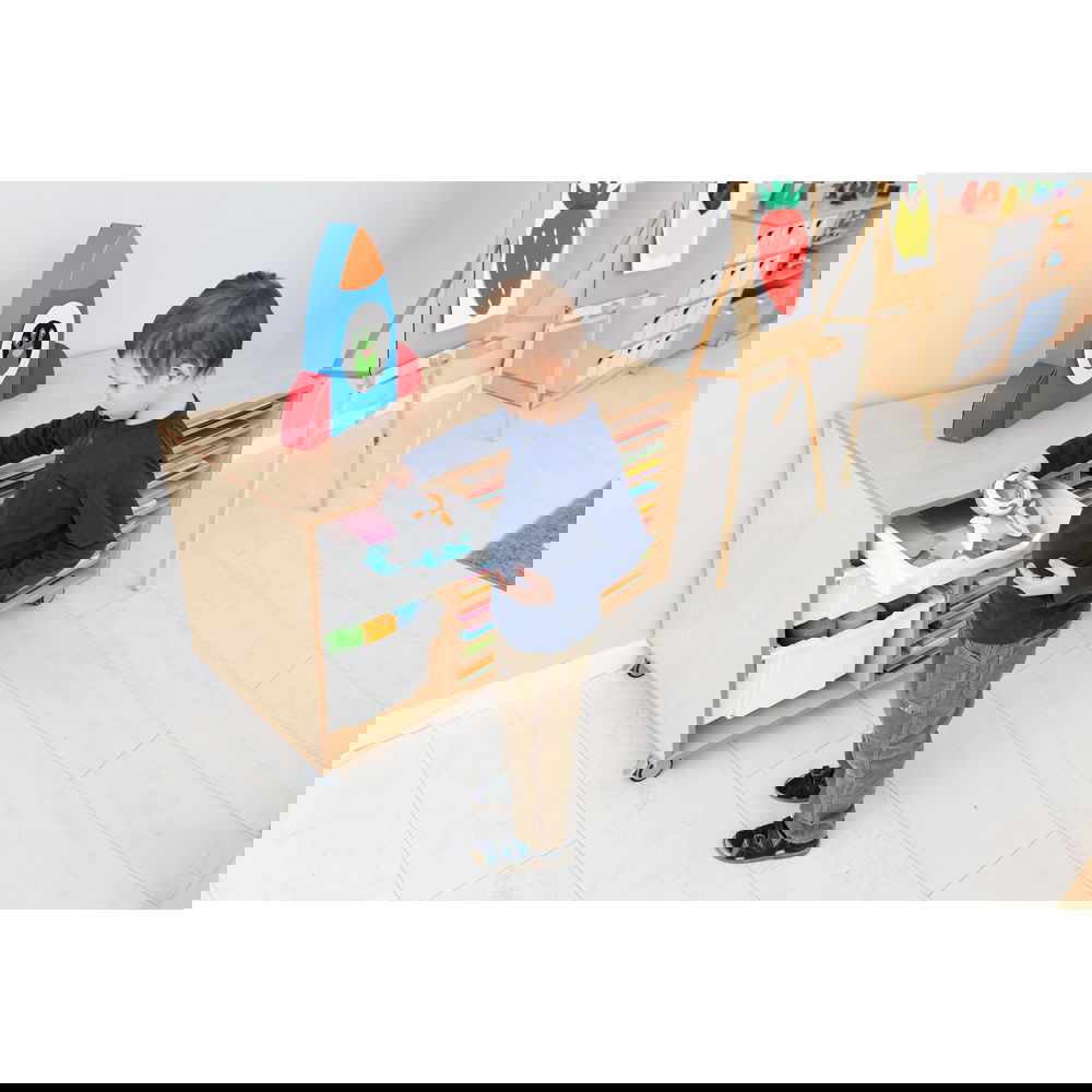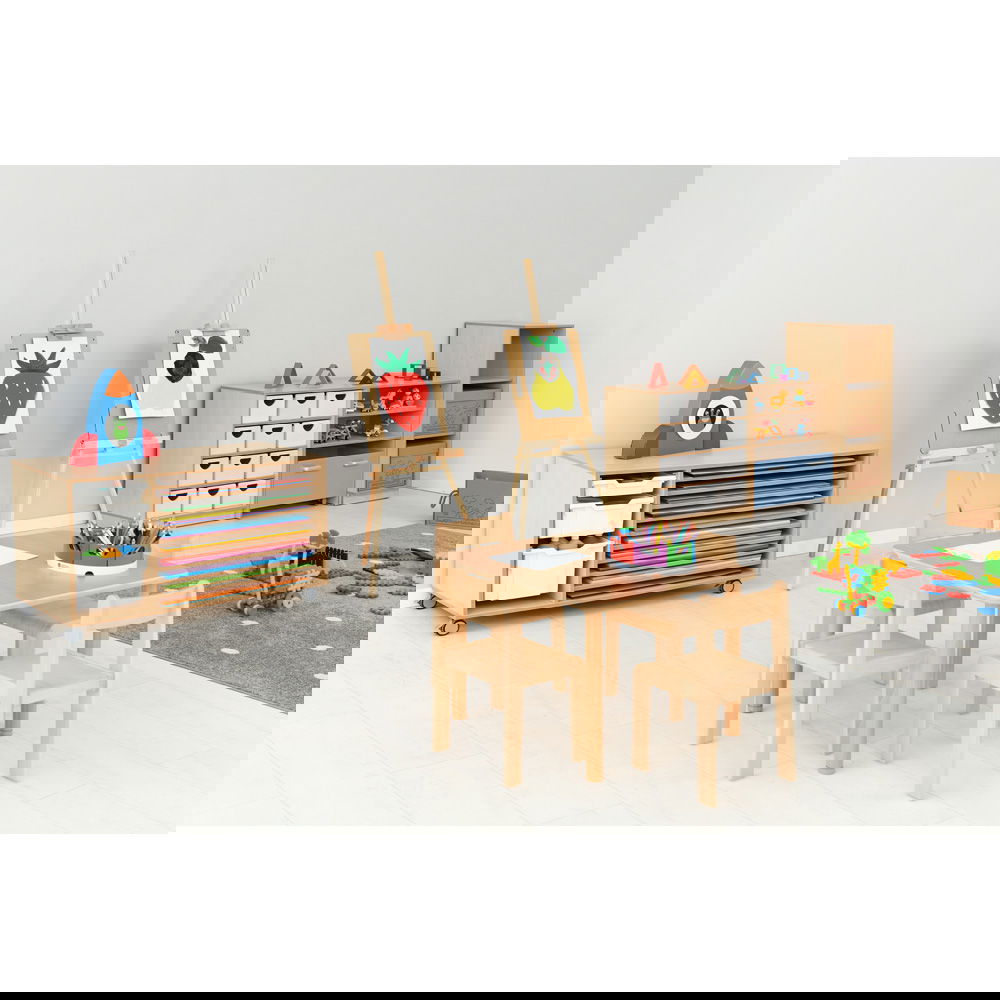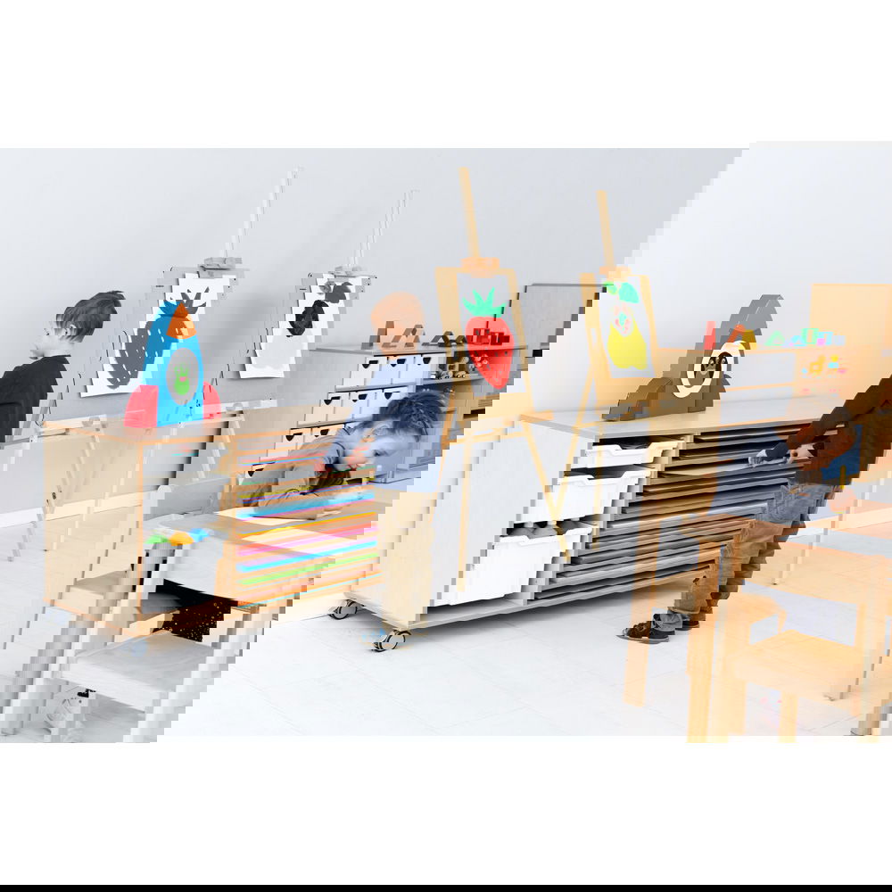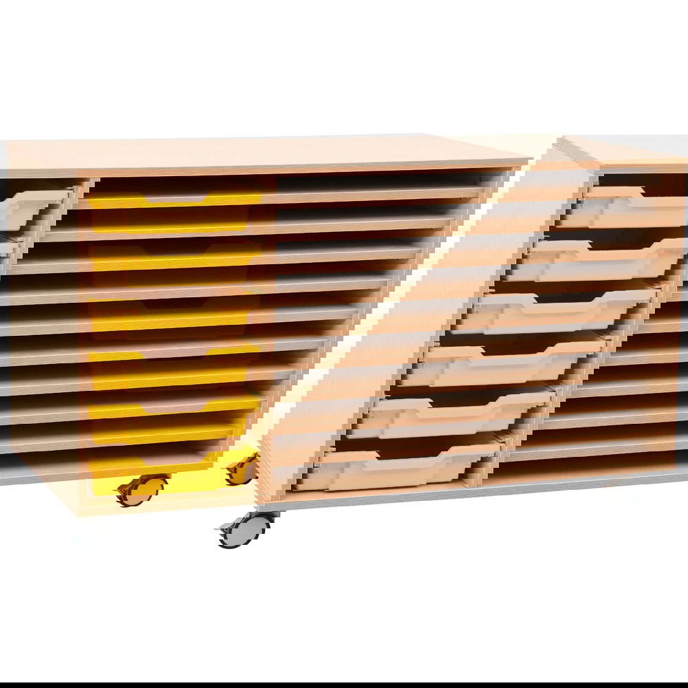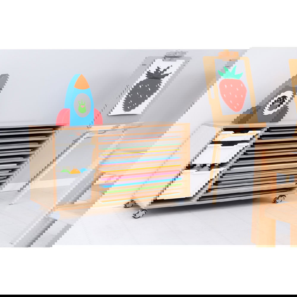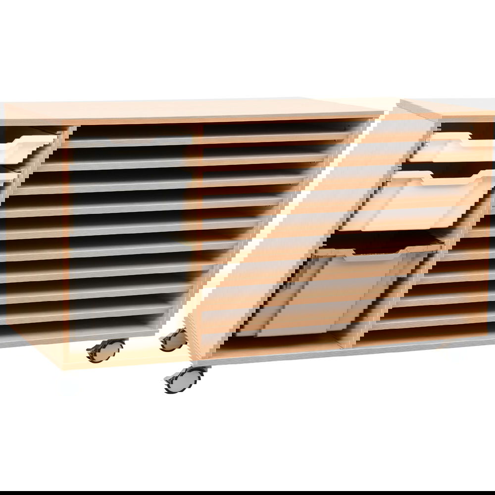 Dank der vier robusten, feststellbaren Rollen lässt sich das Regal mühelos dorthin schieben, wo die Kreativität gerade stattfindet: direkt neben den Zeichentisch, in die Mitte des Gruppenraums oder zur Materialausgabe. Die clevere Aufteilung bietet auf der einen Seite zehn flache Fächer für Papier, während das geräumige linke Fach flexibel genutzt werden kann – beispielsweise für bis zu sechs unserer flachen Kunststoffbehälter (separat erhältlich), in denen Stifte, Farben oder Scheren ihren Platz finden. Gefertigt aus strapazierfähiger, laminierter Spanplatte im zeitlosen Birke-Dekor, fügt sich das Regal harmonisch in jede Umgebung ein und hält dem täglichen Einsatz in Schulen und Werkstätten problemlos stand.