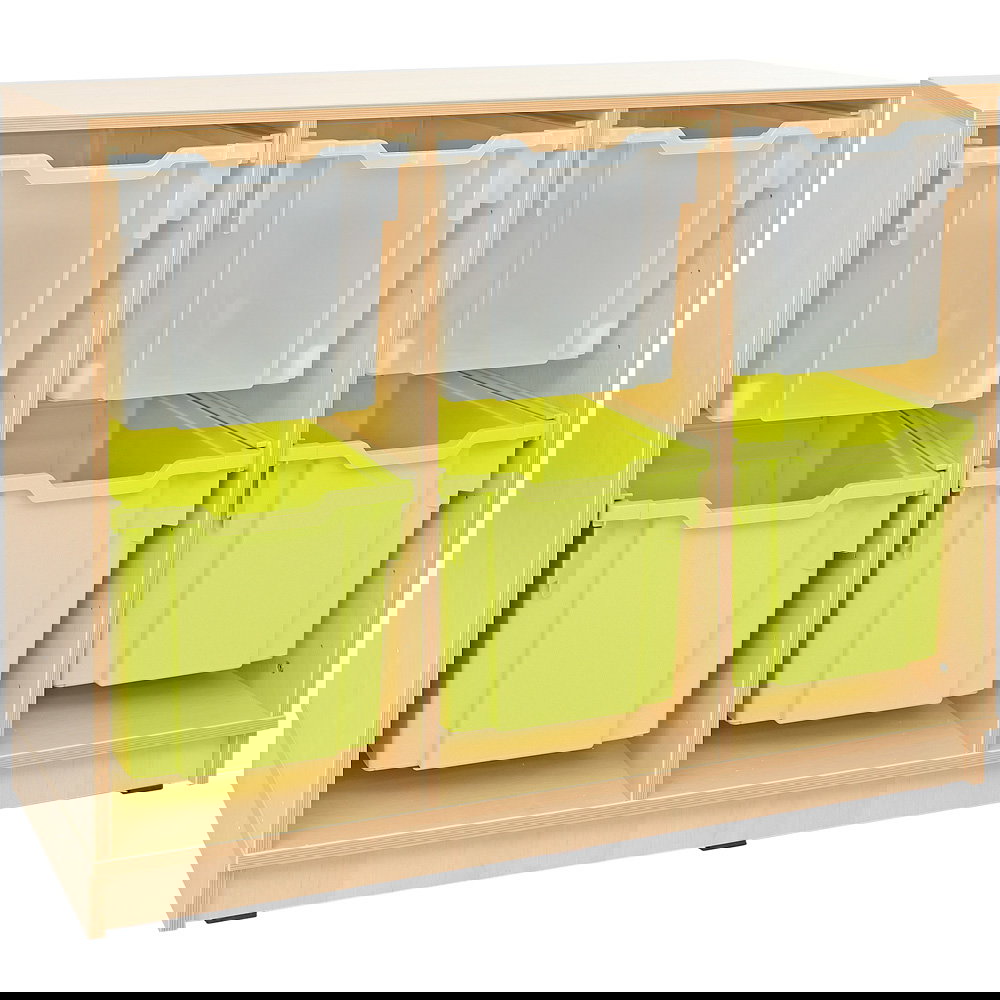Das Besondere an diesem Set ist der Mix der 6 Jumbo-Kunststoffbehälter (Größe 4): Drei transparente Boxen sorgen für sofortigen Durchblick, während drei hellgrüne Boxen frische Farbakzente setzen und visuelle Ruhe schaffen. Diese Mischung ist genial für den Alltag: In den transparenten Behältern finden häufig gesuchte Gegenstände wie Bausteine oder Fahrzeuge ihren Platz – das lästige Suchen entfällt. Die hellgrünen Behälter verbergen hingegen Kleinteile oder Materialien, die optisch weniger „aufgeräumt“ wirken, und sorgen so für ein harmonisches Gesamtbild. Zusammen mit dem robusten Korpus im natürlichen Birke-Dekor entsteht ein Möbelstück, das Funktionalität und Ästhetik perfekt vereint.