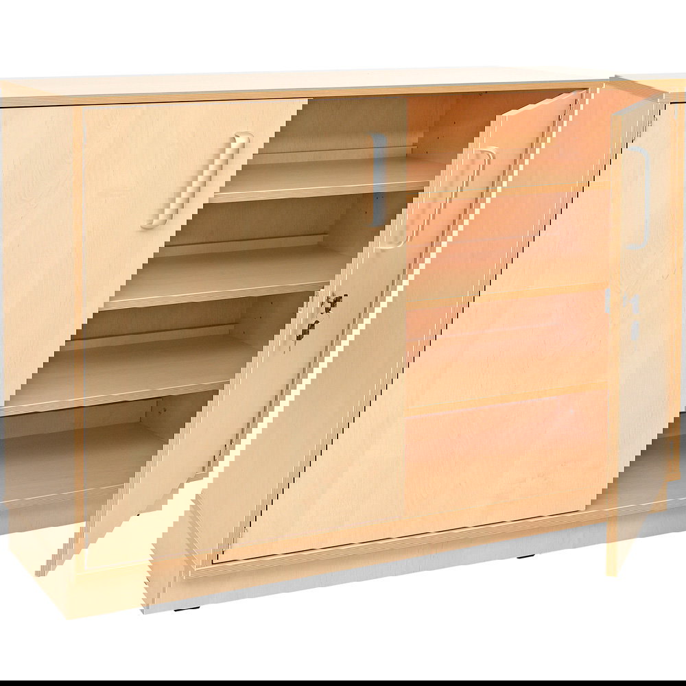 Dieser breite, mittelhohe Schrank ruht auf einem stabilen Sockel, der ihm eine solide Präsenz verleiht. Hinter den zwei robusten Türen verbergen sich drei durchgehende Einlegeböden, die den Innenraum in vier breite Ebenen gliedern. Diese Struktur ist ideal für die übersichtliche Lagerung von großformatigen Ordnern, Bücherreihen oder Materialboxen. Dank der abschließbaren Türen können Sie hier bedenkenlos auch wertvolle Geräte, vertrauliche Dokumente oder Materialien lagern, die nur unter Aufsicht verwendet werden sollen. So schaffen Sie eine Umgebung, die Ordnung, Sicherheit und Ästhetik perfekt in Einklang bringt.