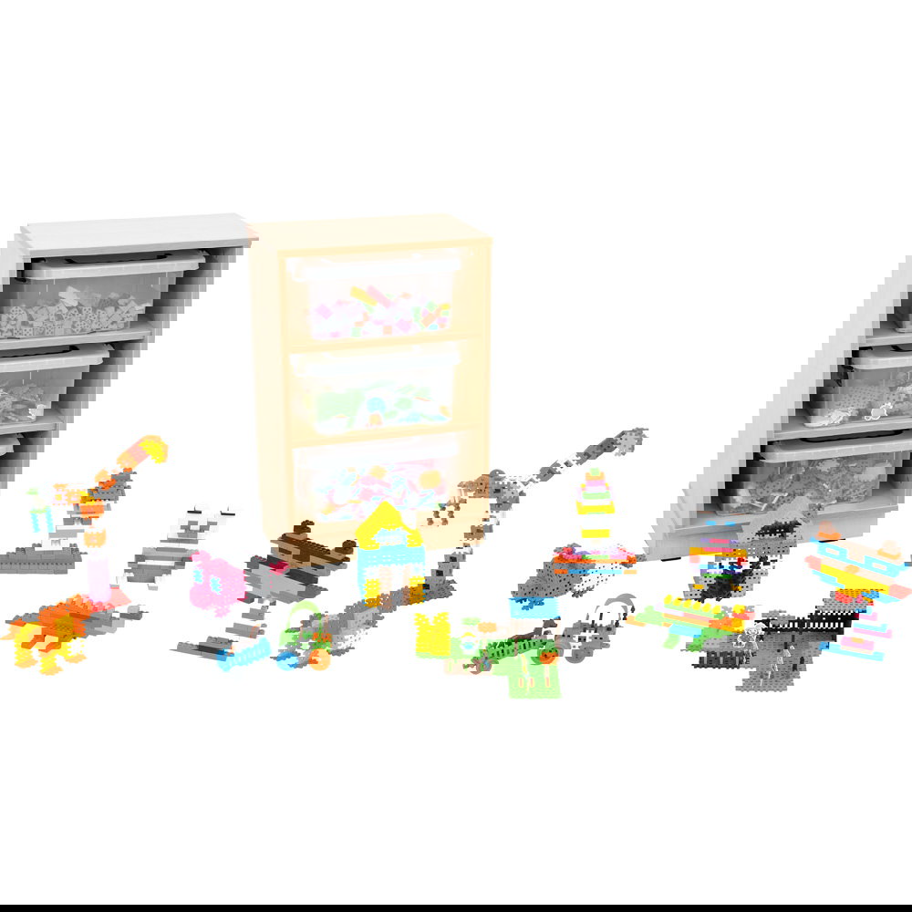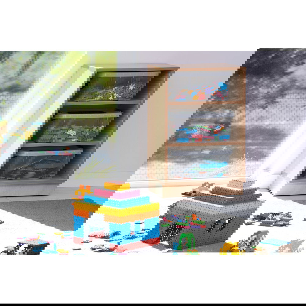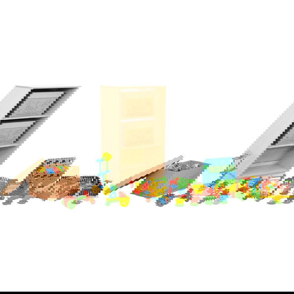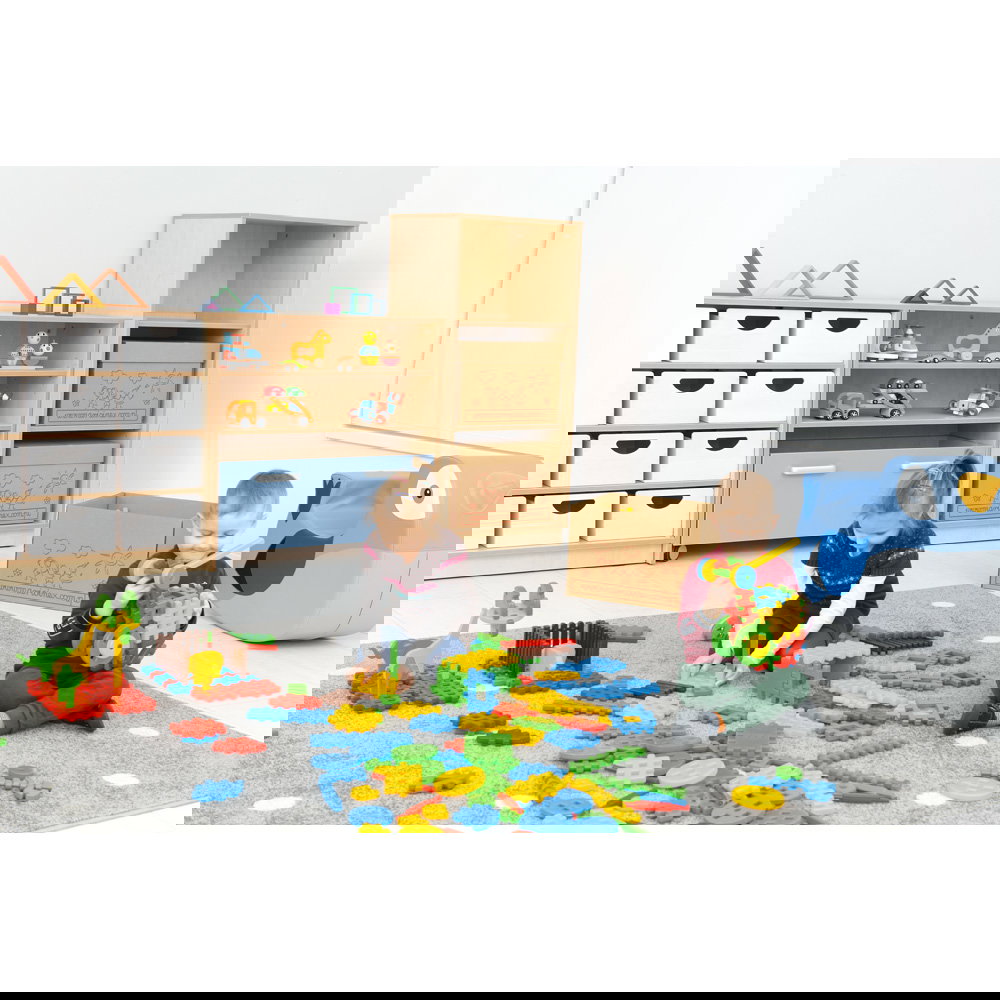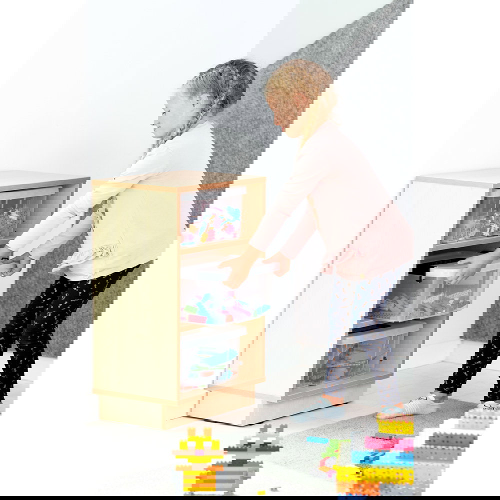 Schluss mit verstreuten Einzelteilen. Dieser Schrank ist speziell dafür konzipiert, die großen Mengen an Bausteinen aufzunehmen. Die passgenauen Behälter nutzen den Stauraum optimal aus und machen das Aufräumen zu einem festen, einfachen Ritual, das Kinder selbstständig bewältigen können.