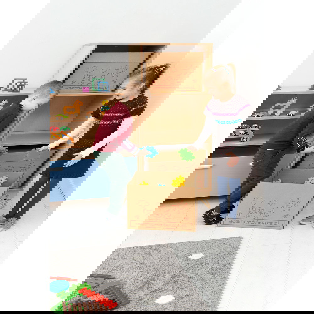 Bei der Mini-Variante sorgen transparente Kunststoffbehälter dafür, dass der Inhalt sofort erkennbar ist. Das spart Zeit beim Suchen und animiert zum Spielen. Die Standard-Variante setzt auf robuste Karton-Behälter, die auch gröberem Umgang standhalten.