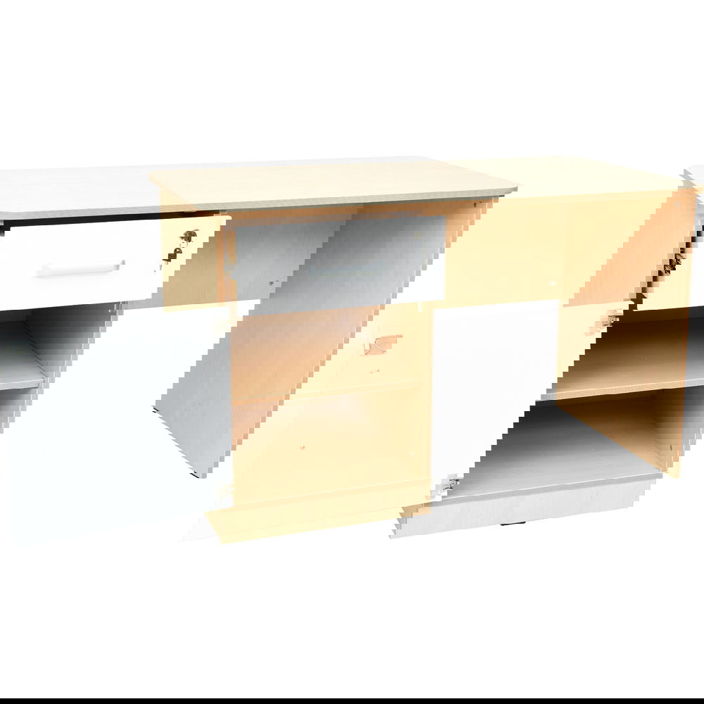 Die Besonderheit dieses Schreibtischs liegt im linksseitig angeordneten Schrankelement. Es bietet nicht nur eine geräumige Schublade für Schreibutensilien, sondern auch ein großes Schrankfach mit einem flexiblen Einlegeboden. Das Beste daran: Sowohl die Schublade als auch das Schrankfach sind abschließbar. So können Sie vertrauliche Dokumente, Prüfungsunterlagen oder persönliche Wertsachen sicher verwahren, selbst wenn der Schreibtisch in einem belebten Umfeld steht. Die durchdachte Konstruktion mit einer dezenten Rückwand als Sichtschutz rundet das professionelle Erscheinungsbild ab und schafft eine klare Abgrenzung des Arbeitsbereichs.