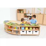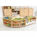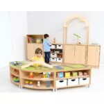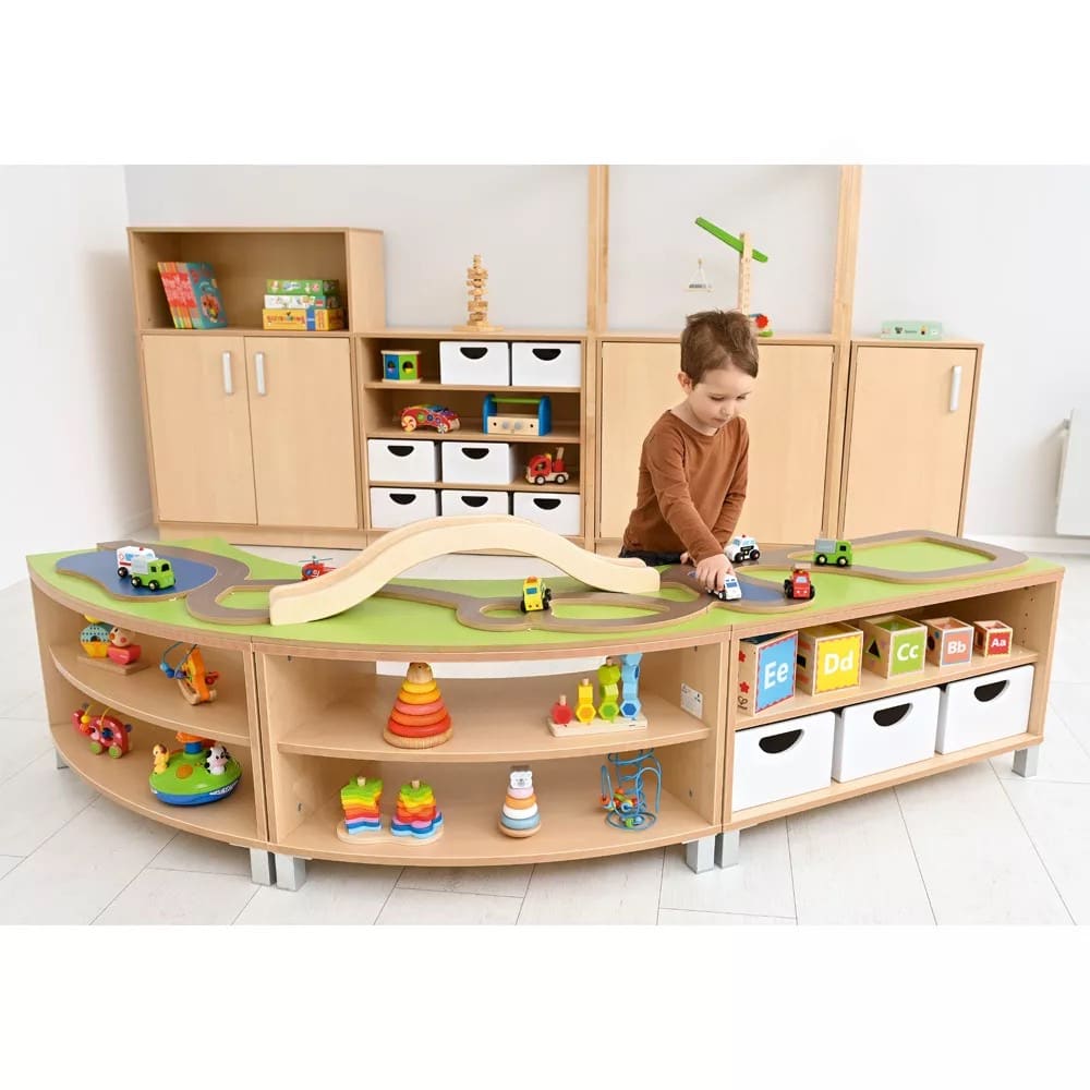 - Praktische Schränke und Fächer Unterhalb der Spielfläche verstecken sich zwei Bogenschränke sowie ein Schrank mit einem Einlegeboden. Diese Elemente bieten reichlich Stauraum für Spielzeug, Puppen, Bauklötze und mehr.