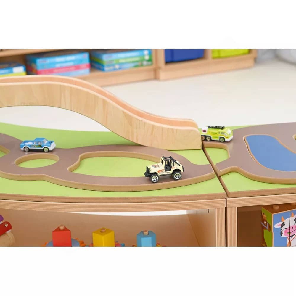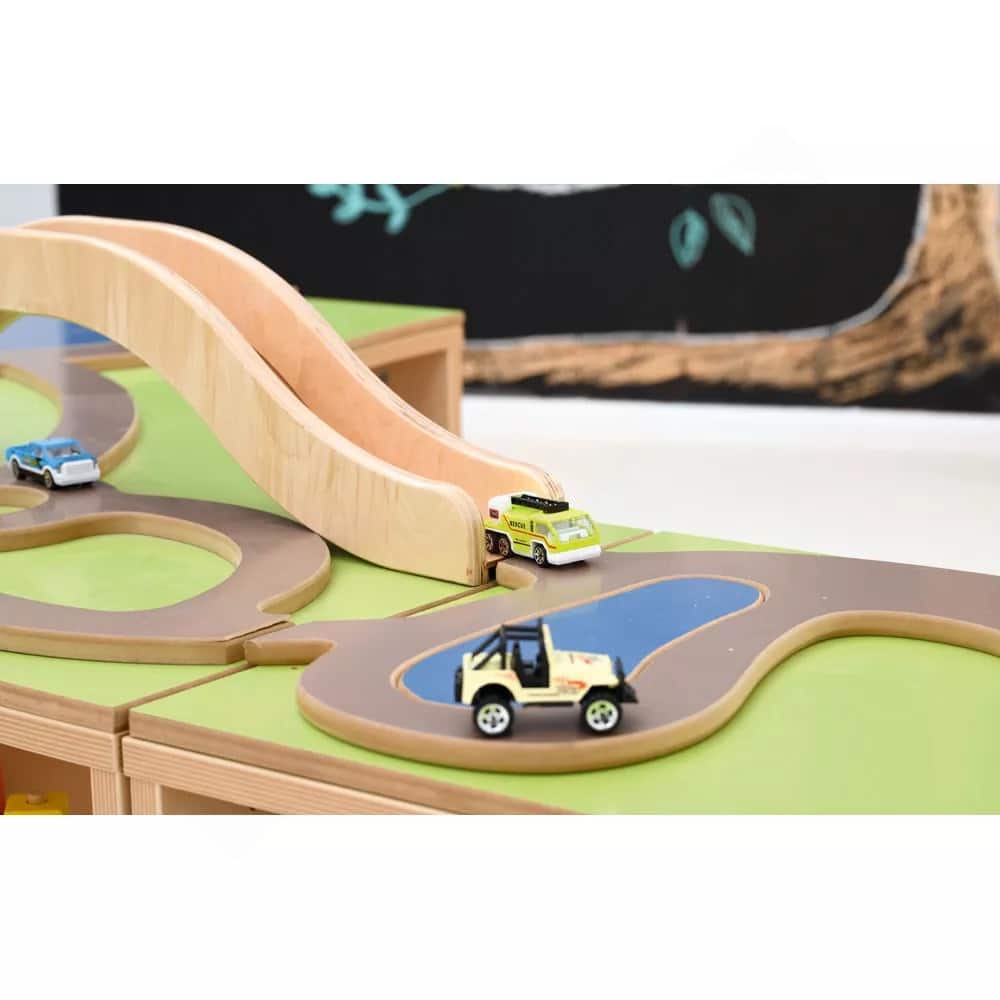 - Kreative Spielflächen und Brücke Die Brücke als zentrales Element der Spiellandschaft regt die Fantasie der Kinder an – ob sie eine Straße überqueren oder imaginäre Abenteuer erleben, die Möglichkeiten sind unbegrenzt.