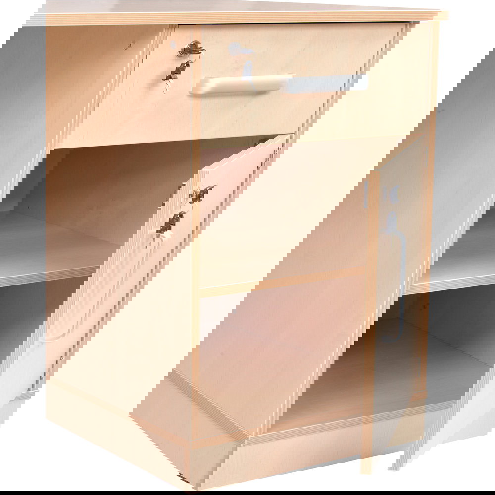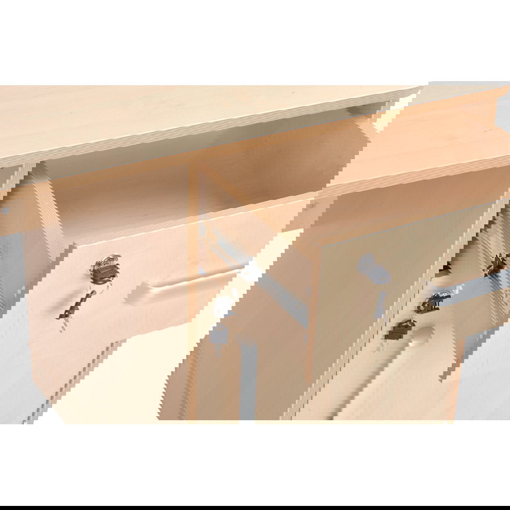 Flexi-TB Schreibtisch (B-s1,d0 schwer entflammbar) in Ahorn-Optik. Mit abschließbarem Schrank & Schublade. Ideal für Brandschutzbereiche in Kita & Schule.