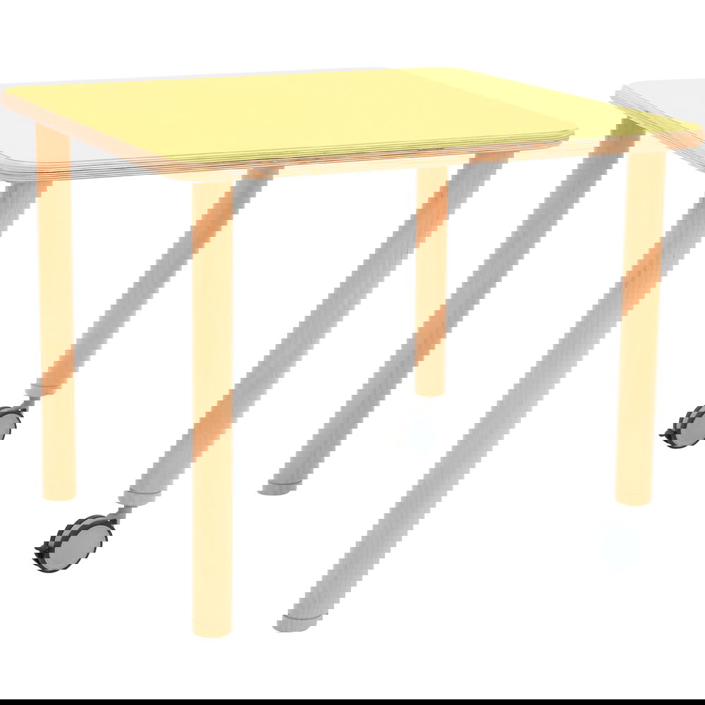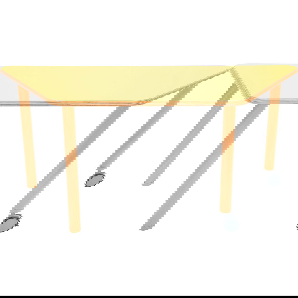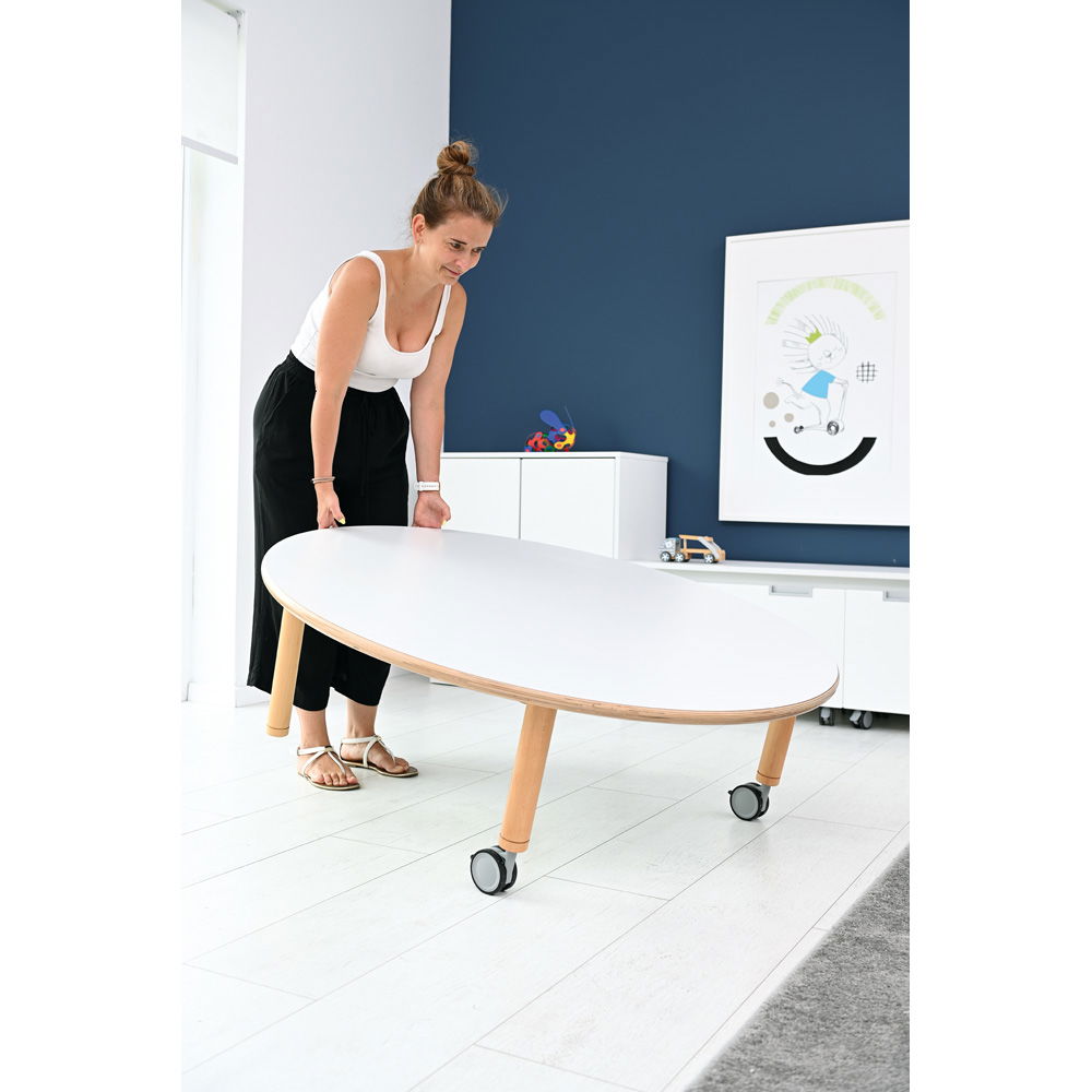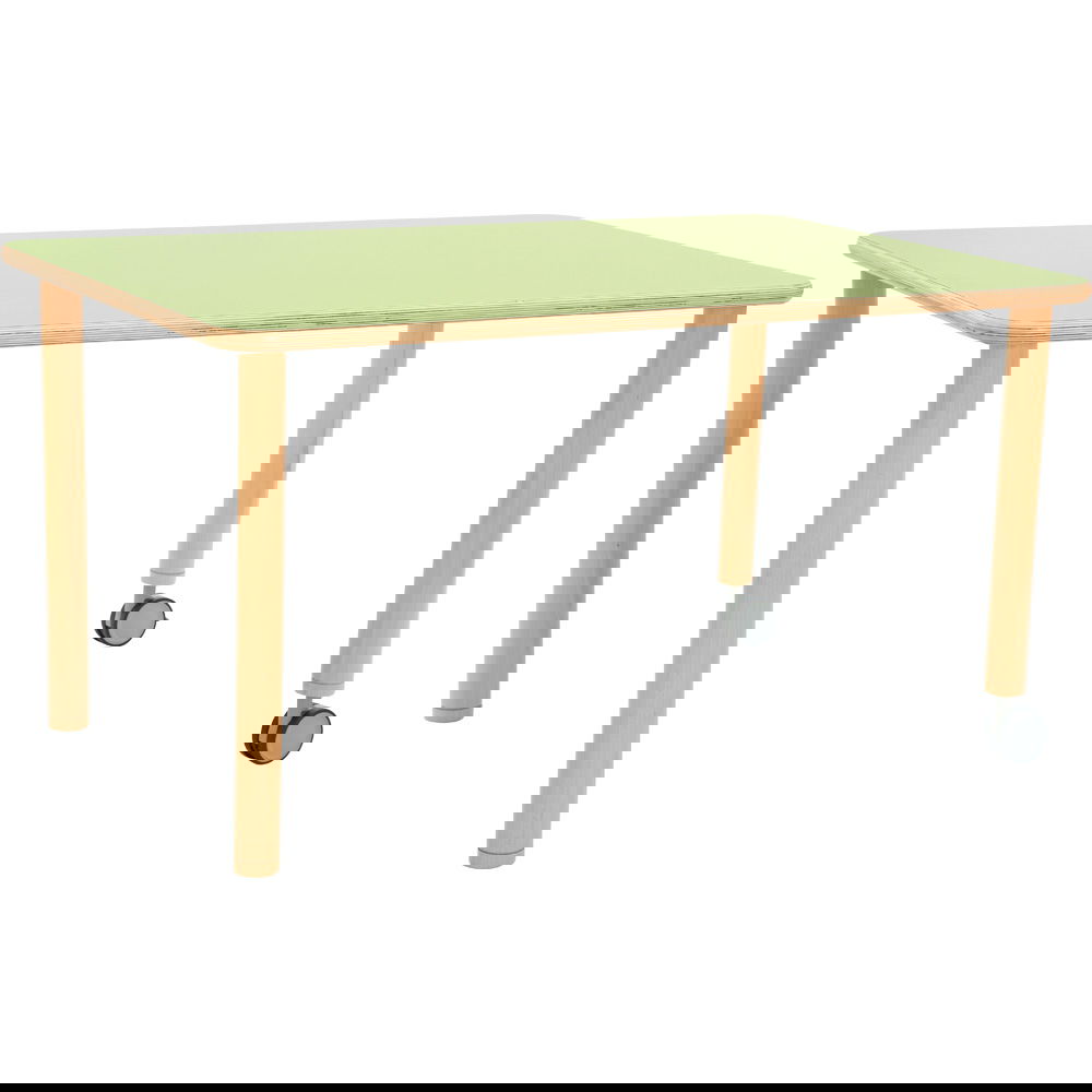 Das Prinzip ist so einfach wie genial: Möchten Sie den Tisch umstellen, heben Sie ihn einfach an der Seite der festen Beine leicht an und rollen ihn mühelos an den gewünschten Ort – ideal für Erzieherinnen und Lehrkräfte, die Räume schnell und rückenschonend umgestalten möchten. Sobald der Tisch steht, sorgen die feststellbaren Rollen dafür, dass er sicher an Ort und Stelle bleibt. Die Rollen selbst sind hochwertig verarbeitet, laufen besonders leise und schonen den Bodenbelag.