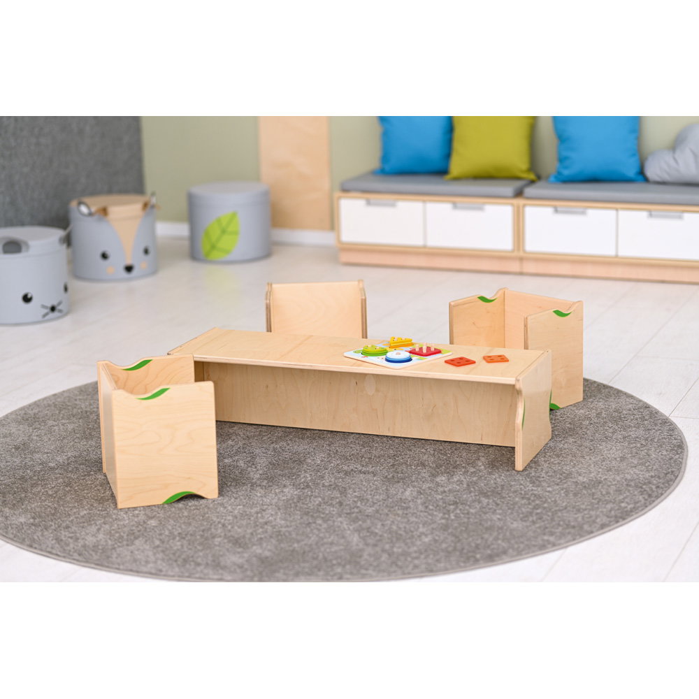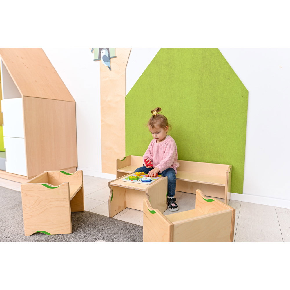 Mit einer Breite von 100 cm bietet die Bank genügend Platz für zwei bis drei Kinder. Das lädt dazu ein, nebeneinander zu sitzen, sich auszutauschen oder gemeinsam an einem langen Papierstreifen zu malen, wenn die Bank als Tisch genutzt wird. So entstehen ganz natürlich Momente der Kooperation und Freundschaft. - Robustes Material für den täglichen Einsatz