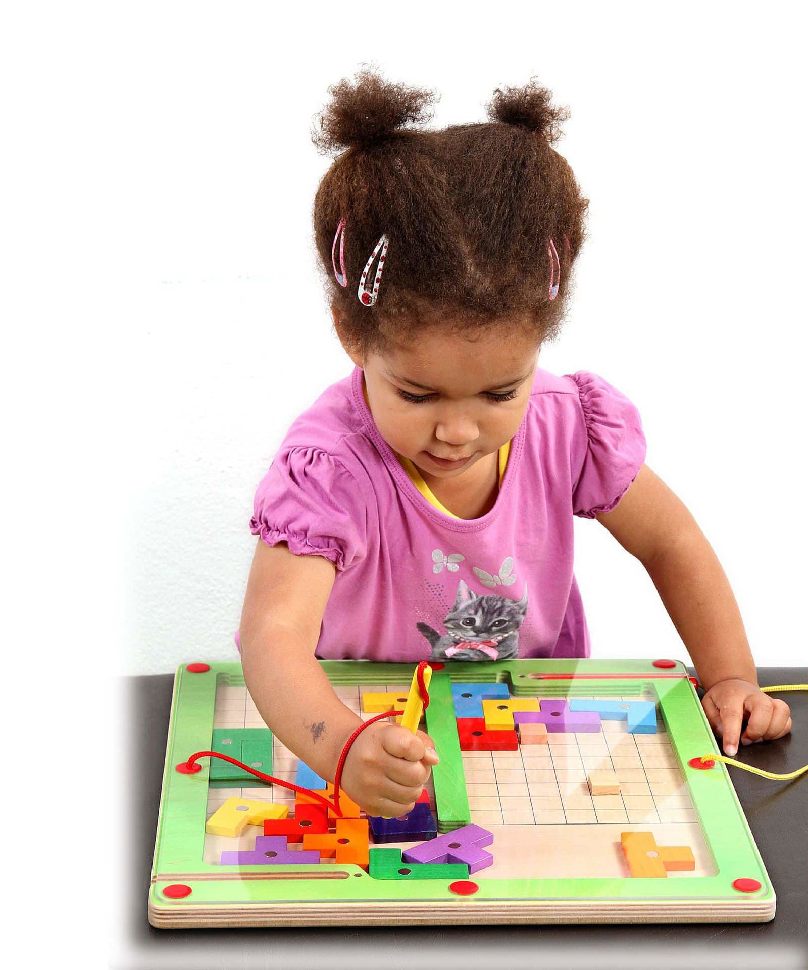 Spielbrett aus Holz mit Acrylglasplatte. Das „Magnetris“ ist ein Fliesenpuzzle mit 19 unterschiedlichen T- und L-förmigen Holzelementen, die sich mit zwei Magnetstiften verschieben lassen. Gefordert werden strategisches und räumliches Denken sowie die Geschicklichkeit der Spieler. Enthält zwei Magnetstifte.