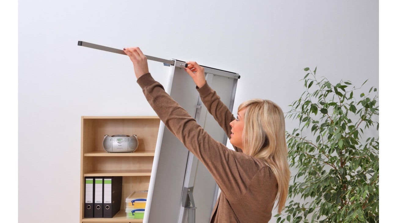 • Komfortable Ablagefläche: Auf der durchgehenden Ablage finden viele Flipchart-Stifte ausreichend Platz, sodass Sie während Ihres Vortrags alles an einem Ort haben. Auch die aufklappbaren Blockhalter mit verstellbaren Zapfen ermöglichen einen schnellen Blockwechsel – so bleiben Sie in der Präsentation immer flexibel und effizient.