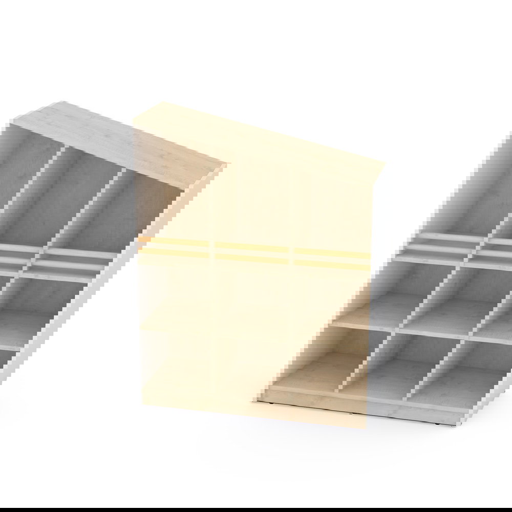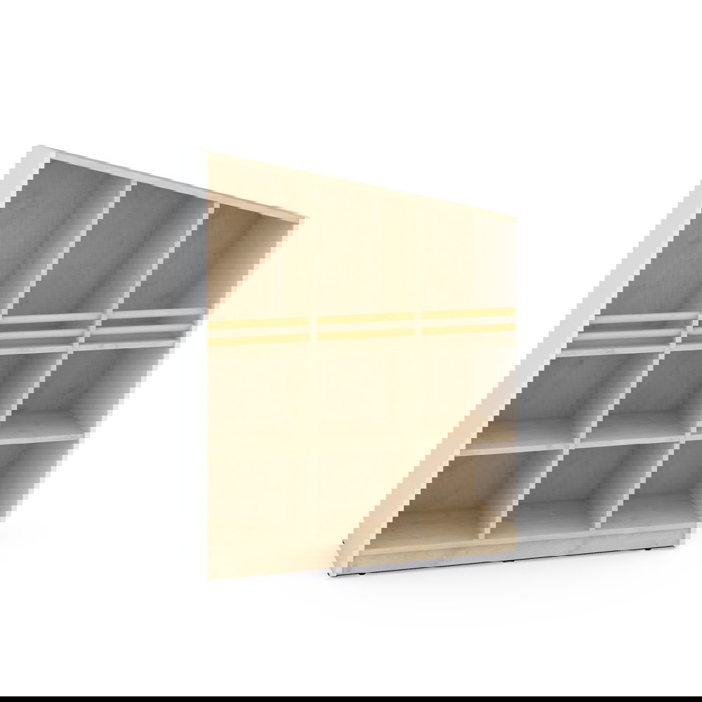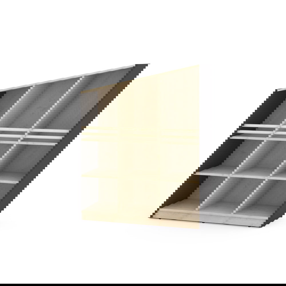 Der Schrank passt sich Ihren Bedürfnissen an. Die großzügigen unteren Fächer bieten viel Volumen und können optional mit separat erhältlichen Türen oder Schubladen ergänzt werden. So entscheiden Sie selbst, was offen sichtbar bleibt und was diskret verschwinden soll. - Spielerische Modularität