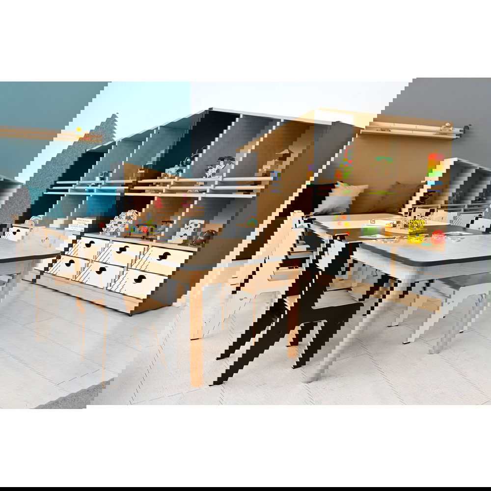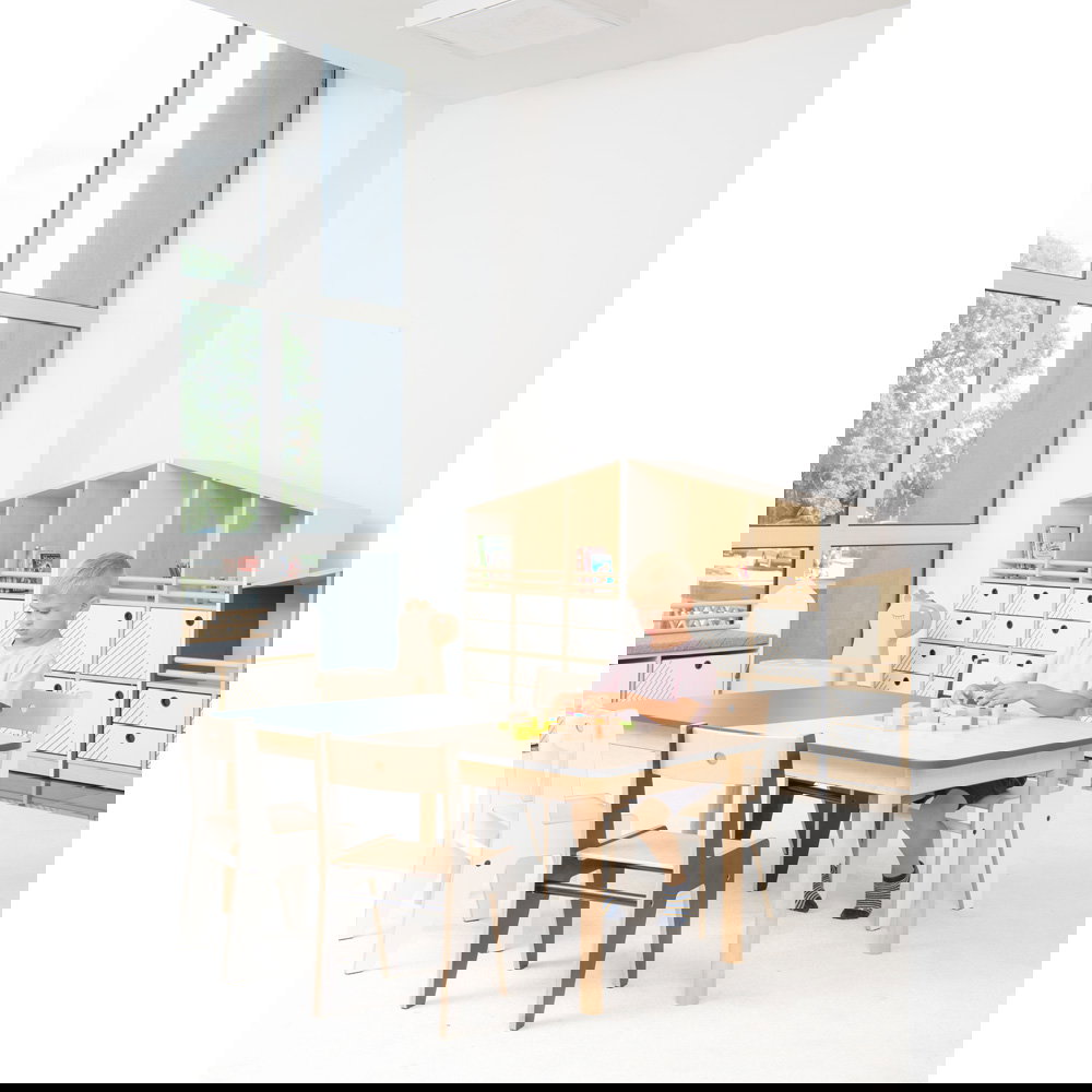 Kindergärten und Schulen stellen hohe Anforderungen an Möbel. Der FLO Schrank L ist darauf vorbereitet: Hochwertige laminierte Spanplatten und eine 2 mm starke, stoßfeste ABS-Kante garantieren, dass der Schrank auch nach Jahren intensiver Nutzung noch gut aussieht.