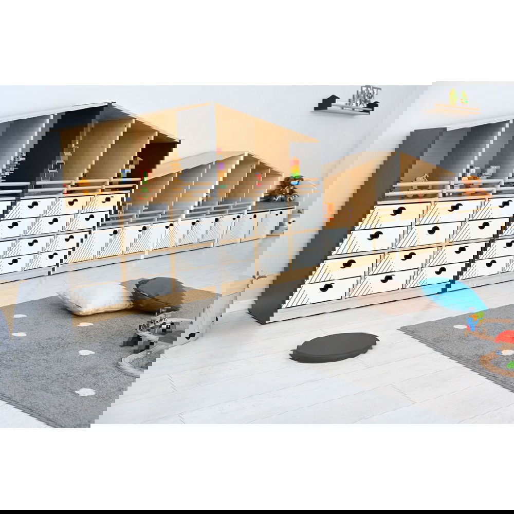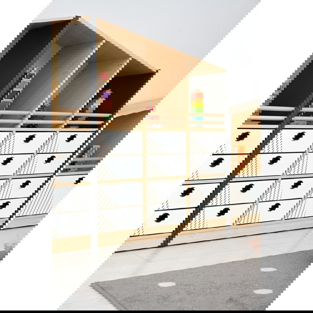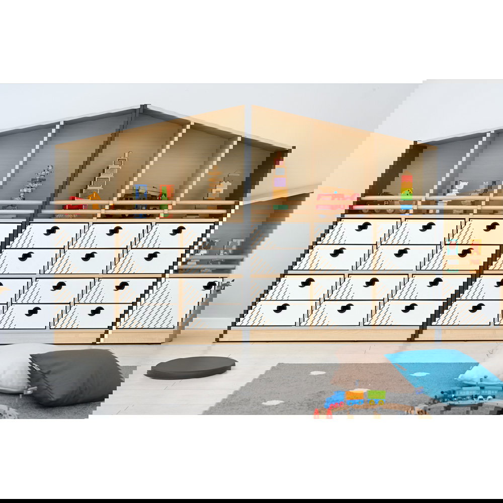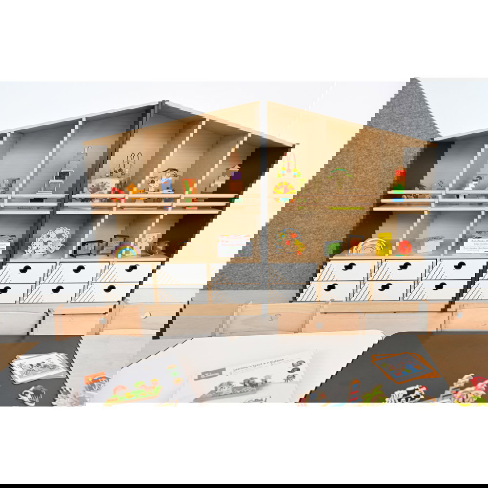 Mit einer Spitzenhöhe von 130 cm nutzt der Schrank L die Vertikale effizient aus. Er bietet nicht nur mehr Stauraum auf gleicher Grundfläche, sondern fungiert durch seine Giebelform auch als architektonisches Highlight, das dem Raum Struktur und eine spielerische Note verleiht. - Maximale Sicherheit im offenen Bereich