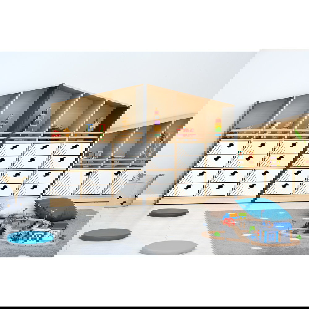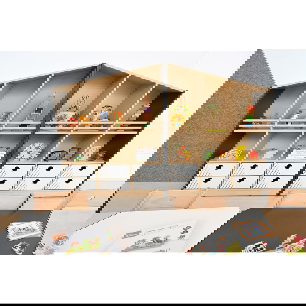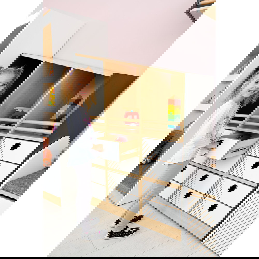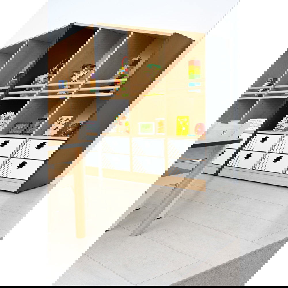 Das oberste Fach ist offen gestaltet, damit Kinder ihre Schätze stolz präsentieren können. Dank der robusten Rundstäbe aus Massivholz ist sichergestellt, dass auch bei wilderem Spiel nichts herausfällt. Das fördert die Selbstständigkeit beim Ein- und Ausräumen. - Flexibles Stauraumkonzept