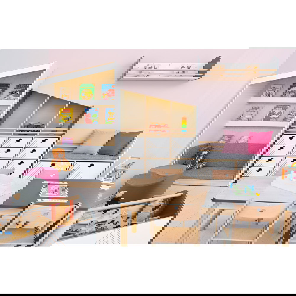 Dieses Design lädt zum kreativen Gestalten ein: Kombinieren Sie zwei Schränke mit entgegengesetzten Giebeln, entsteht ein gemütliches „Haus“. Reihen Sie mehrere Elemente aneinander, wächst im Kinderzimmer eine majestätische „Bergkette“ empor. Der FLO Schrank L bietet dabei viel Platz für alles, was im Kinderalltag wichtig ist. Im oberen, offenen Bereich präsentieren sich Bücher und Lieblingsspielzeuge sicher hinter massiven Holzstäben, während die unteren Fächer flexibel gestaltet werden können. Der Mix aus natürlichem Ahorn-Dekor und modernen Seitenwänden in Weiß oder Anthrazit sorgt für eine frische, zeitgemäße Optik, die sich harmonisch in jede Lern- und Spielumgebung einfügt.