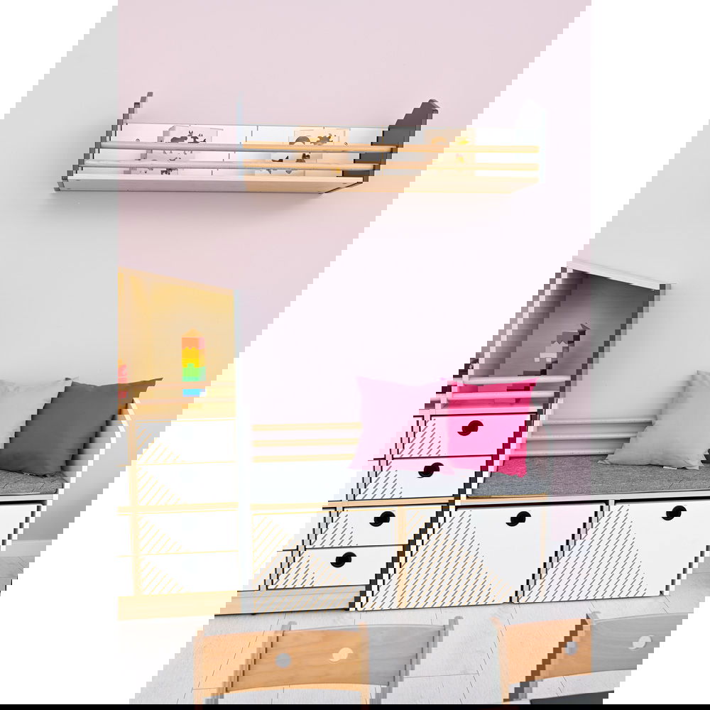 Die beiden integrierten Massivholz-Rundstäbe fungieren als zuverlässiger Herausfallschutz. Eltern können beruhigt sein, denn Bücher und Spielzeug sind sicher verwahrt, während Kinder ihre Schätze dennoch leicht erreichen und selbstständig einräumen können. - Schafft wertvollen Platz und Struktur