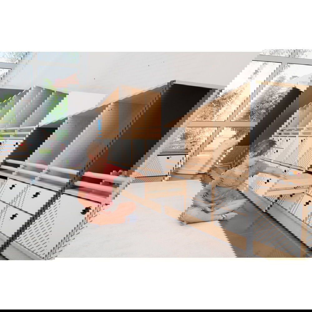 Sie können Ihre FLO-Schränke jederzeit nachträglich mit diesen Schubladen ausstatten. Tauschen Sie eine Tür gegen zwei Schubladen oder füllen Sie ein offenes Fach – so passen Sie Ihre Möbel immer wieder neu an die wachsenden Bedürfnisse Ihres Kindes an.