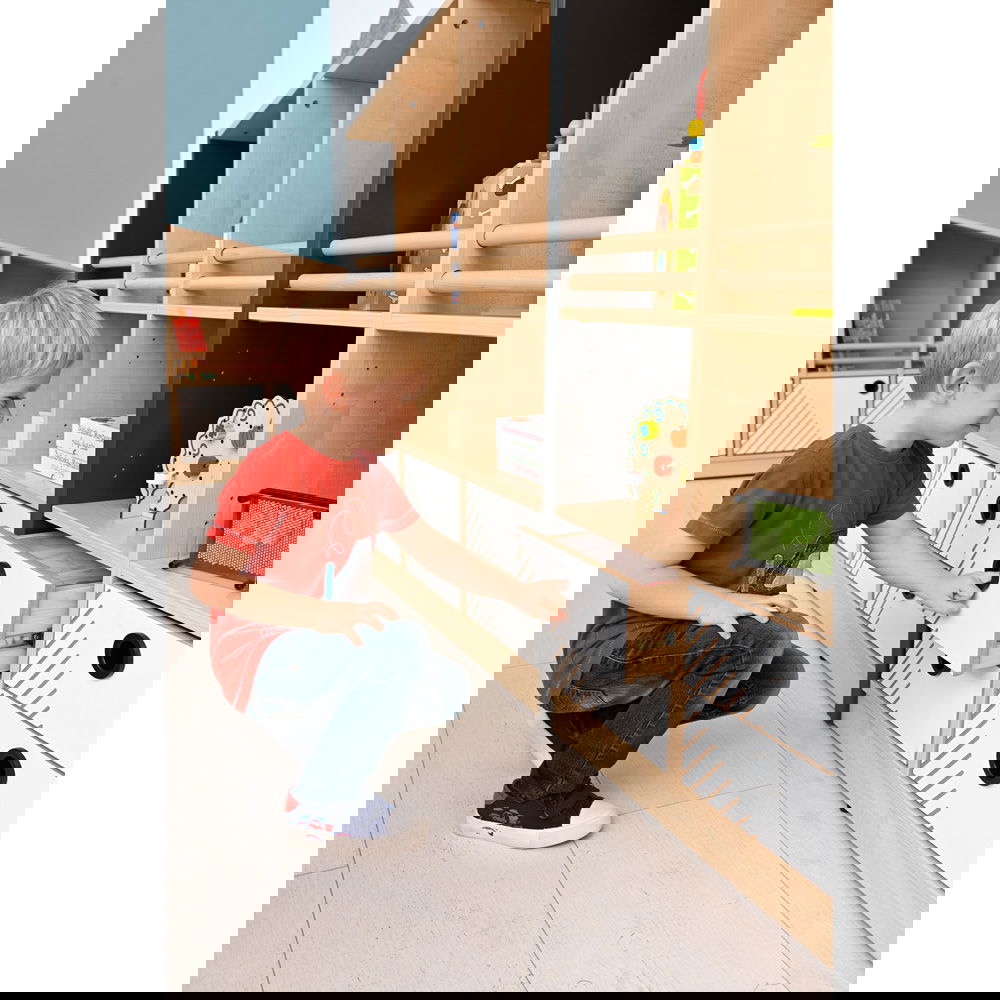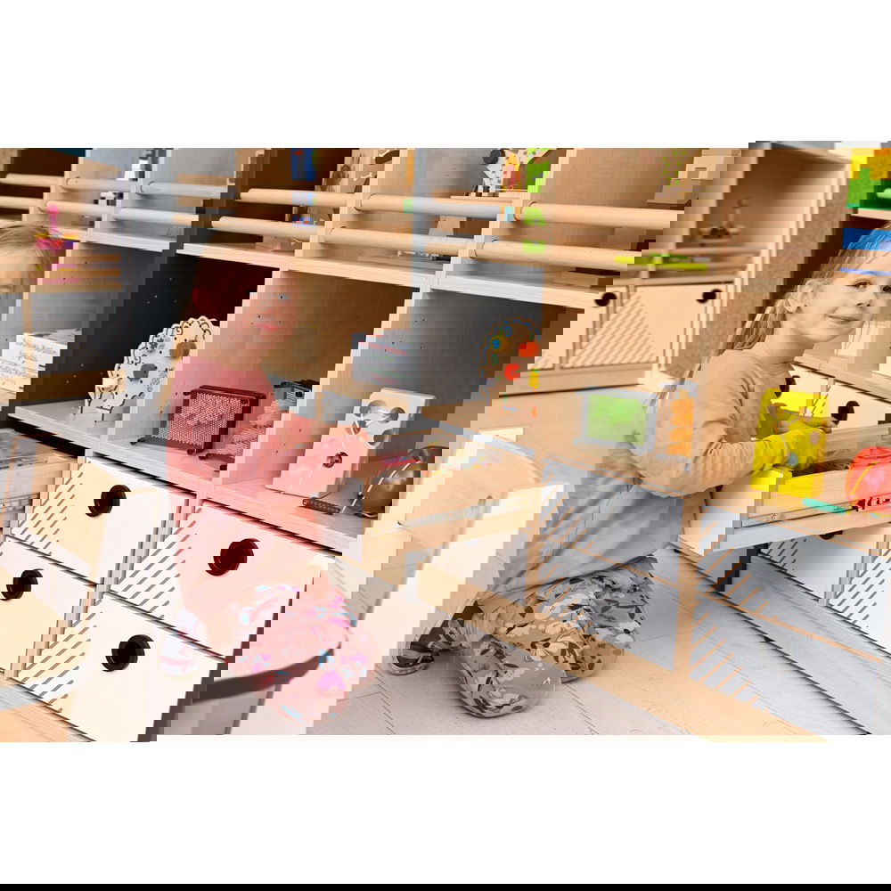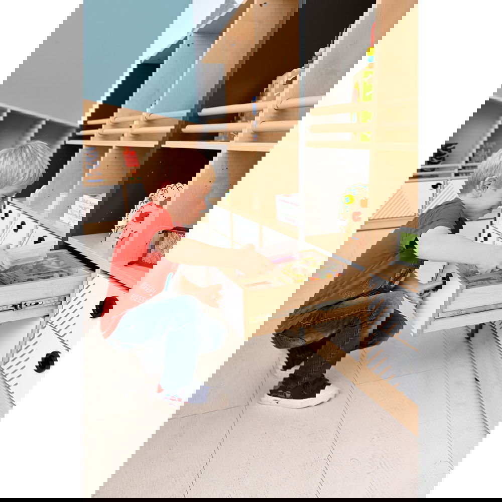 Endlich hat alles seinen Platz! In dieser Schublade lassen sich Stifte, Bastelmaterial, kleine Spielzeuge und andere Schätze übersichtlich verstauen. Das hilft Kindern dabei, selbstständig Ordnung zu halten und den Überblick zu bewahren.