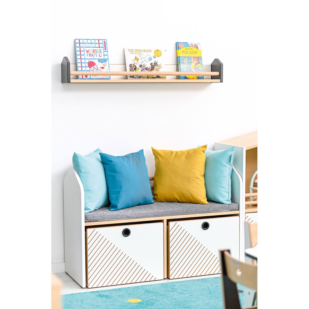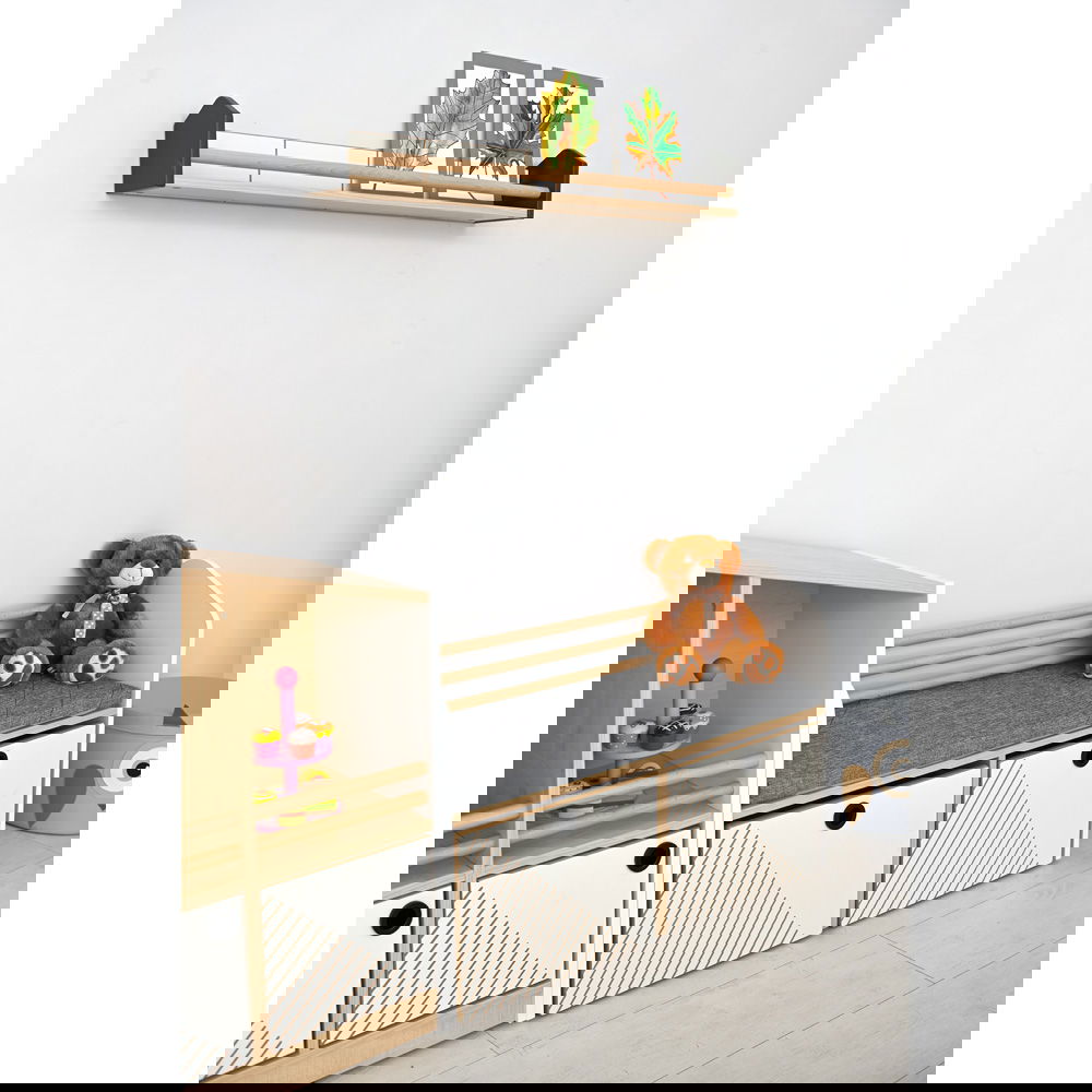 Keine Sorge mehr vor herunterfallenden Büchern oder Spielzeugen. Die beiden horizontalen Massivholz-Rundstäbe bilden eine schützende Barriere. So können Kinder ihre Lieblingsgegenstände selbstständig arrangieren, ohne dass etwas zu Bruch geht. - Schafft Platz an der Wand