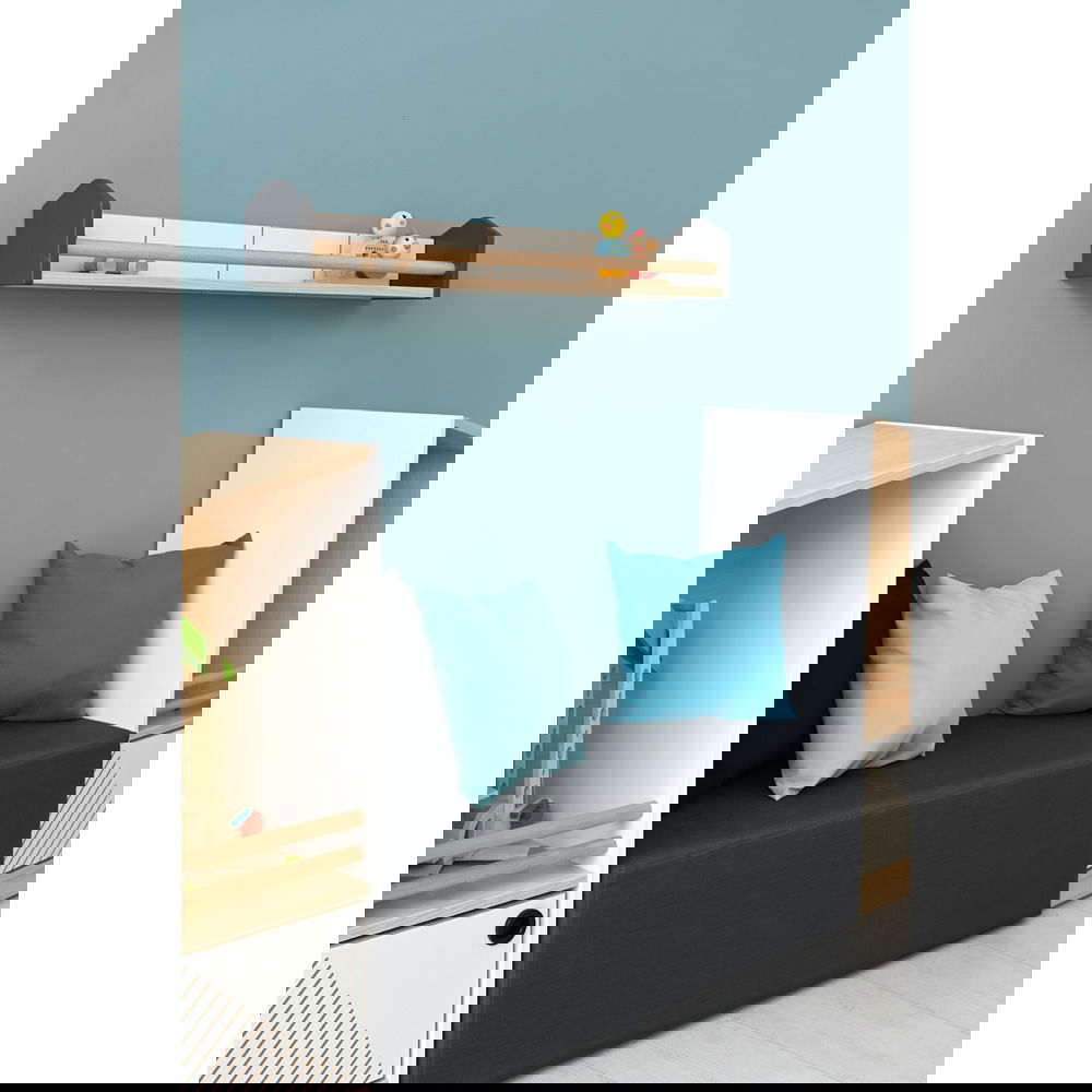 Das Design des Hängeregals greift die charakteristischen Merkmale der Serie gekonnt auf. Die Kombination aus warmem Ahorn-Dekor, modernen anthrazitfarbenen Seiten und einer strahlend weißen Rückwand mit feinen Fräsungen schafft einen spannenden, aber harmonischen Look. Die wahre Stärke liegt jedoch im durchdachten Detail: Zwei Rundstäbe aus massivem Holz an der Vorderseite dienen als dezente, aber effektive Sicherung. Sie sorgen dafür, dass die ausgestellten Schätze auch dann an ihrem Platz bleiben, wenn es im Kinderzimmer mal wieder hoch hergeht. Mit seiner schlanken Tiefe von nur 15 cm fügt sich das Regal elegant in jeden Raum ein, sei es über dem Schreibtisch, dem Bett oder als Ergänzung zu einer bestehenden FLO-Möbellandschaft.