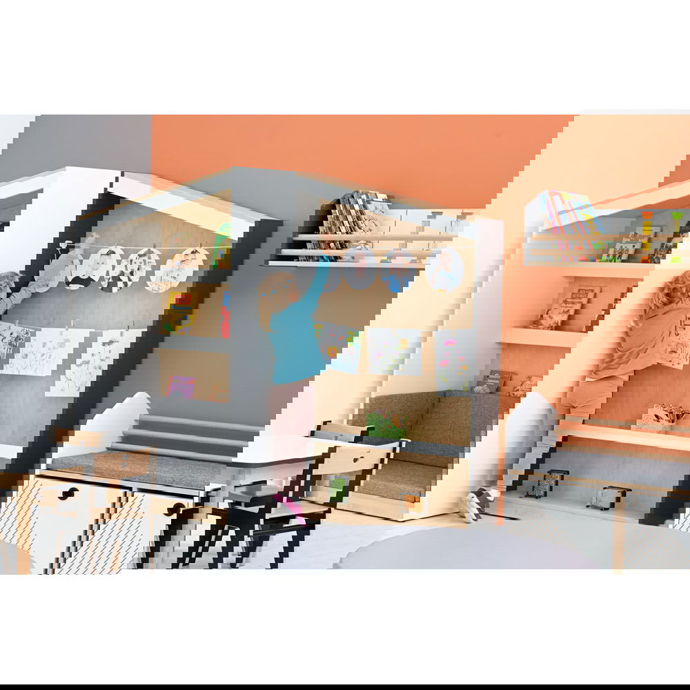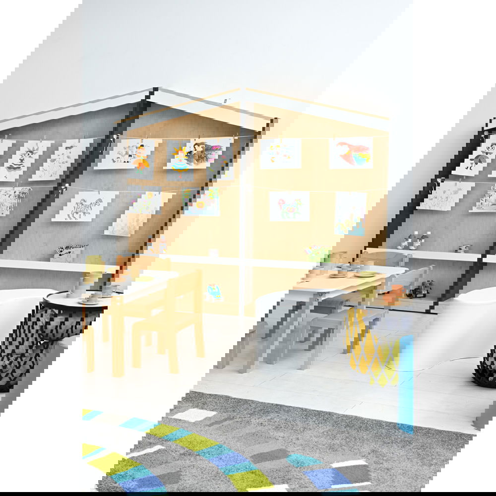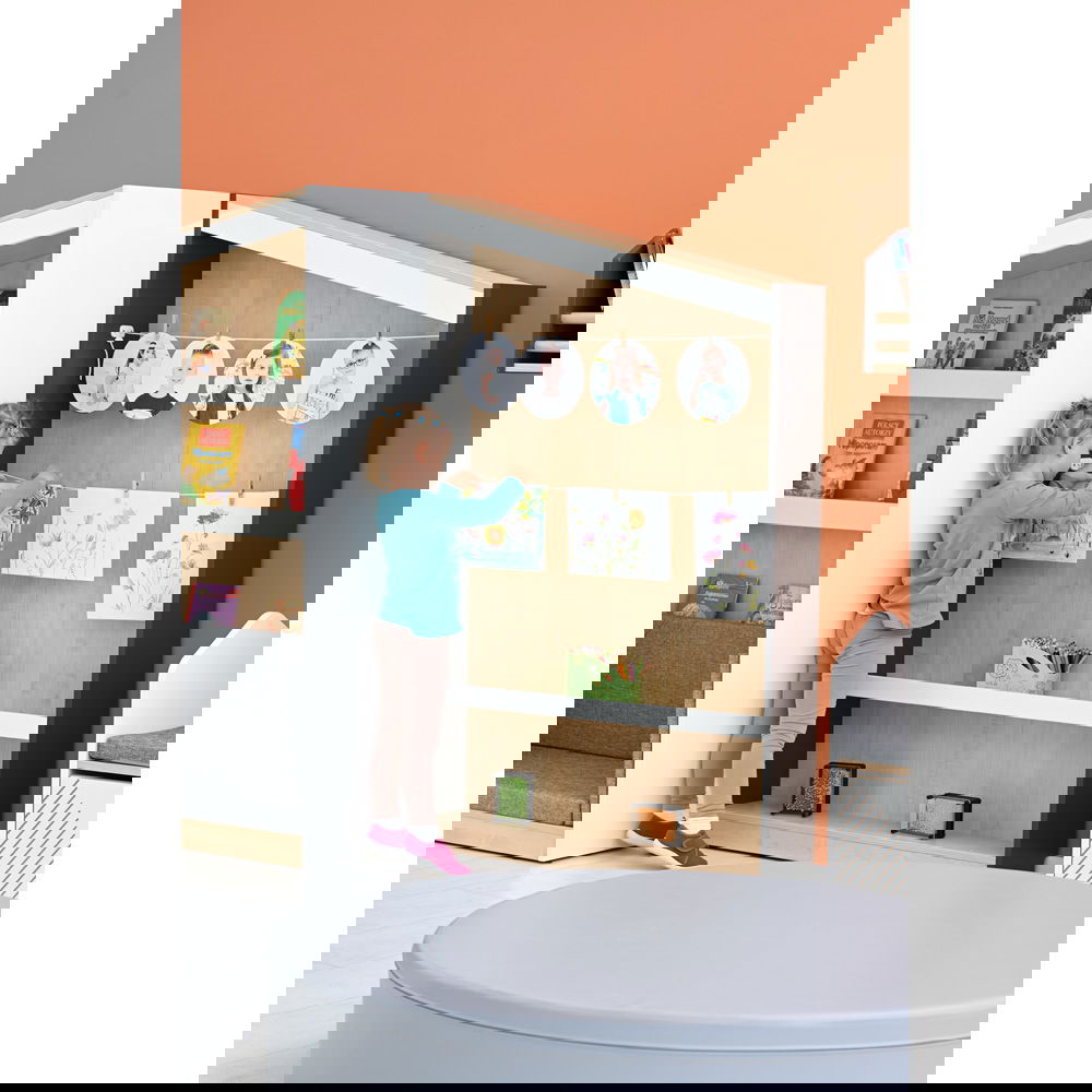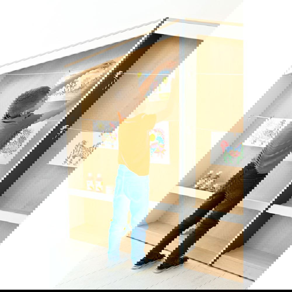 Das Konzept ist so einfach wie genial: An der großen Rückwand sind Schnüre gespannt, an denen Bilder kinderleicht mit kleinen Klammern befestigt werden können – ganz ohne Klebeband oder Reißzwecken. So entsteht eine dynamische Ausstellung, die sich täglich verändern kann. Im unteren Bereich bietet ein schmales Regalbrett zusätzlichen Platz für dreidimensionale Kunstwerke, wie Tonfiguren oder gesammelte Naturschätze. Die Kombination aus warmem Ahorn-Dekor und modernen Seitenwänden in Weiß oder Anthrazit fügt sich harmonisch in jede Lern- und Spielumgebung ein und macht das Regal zum kreativen Mittelpunkt des Raumes.