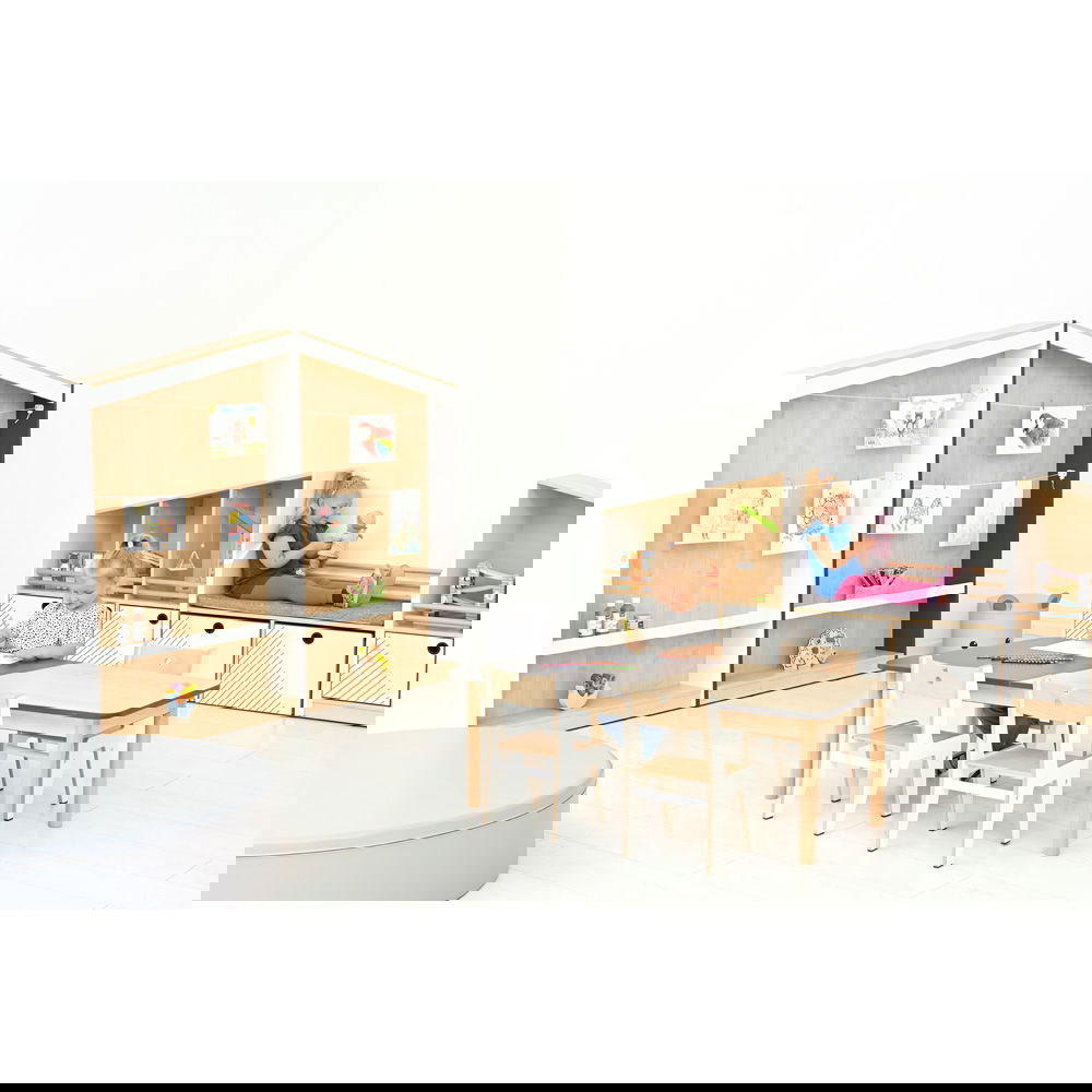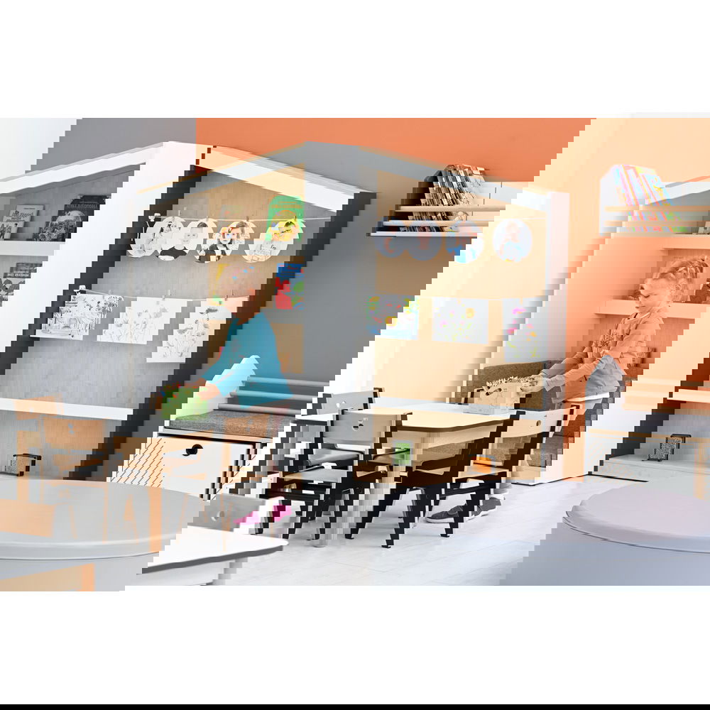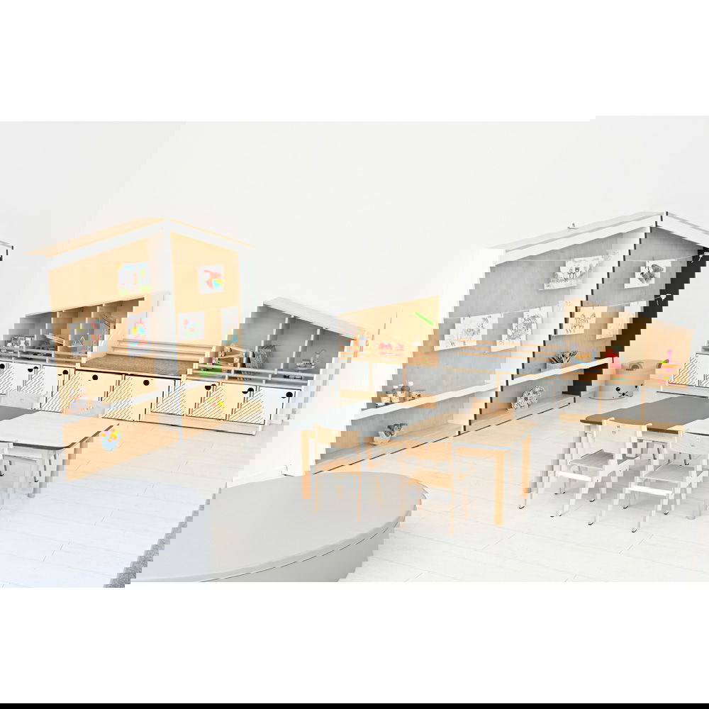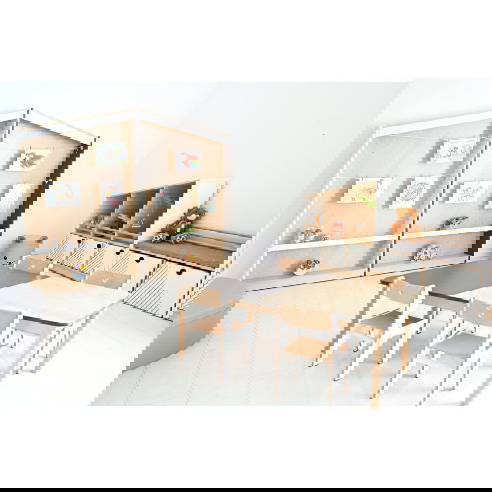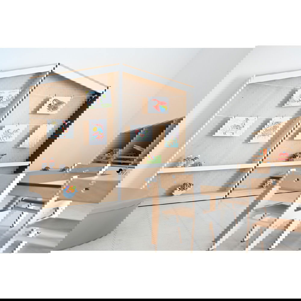 Das Konzept ist so einfach wie genial: An der großen Rückwand sind Schnüre gespannt, an denen Bilder kinderleicht mit kleinen Klammern befestigt werden können – ganz ohne Klebeband oder Reißzwecken. So entsteht eine dynamische Ausstellung, die sich täglich verändern kann. Im unteren Bereich bietet ein schmales Regalbrett zusätzlichen Platz für dreidimensionale Kunstwerke, wie Tonfiguren oder gesammelte Naturschätze. Die Kombination aus warmem Ahorn-Dekor und modernen Seitenwänden in Weiß oder Anthrazit fügt sich harmonisch in jede Lern- und Spielumgebung ein und macht das Regal zum kreativen Mittelpunkt des Raumes.