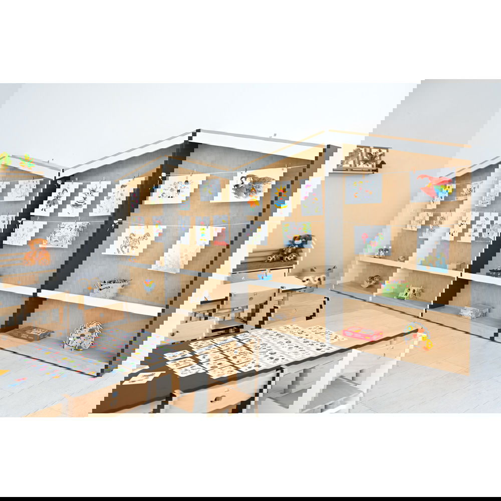 Dank des cleveren Schnur-Systems können schon die Kleinsten ihre Werke selbstständig aufhängen und austauschen. Das fördert das Selbstbewusstsein und die Freude am kreativen Schaffen, da die Ergebnisse sofort gewürdigt werden. - Großzügige Ausstellungsfläche