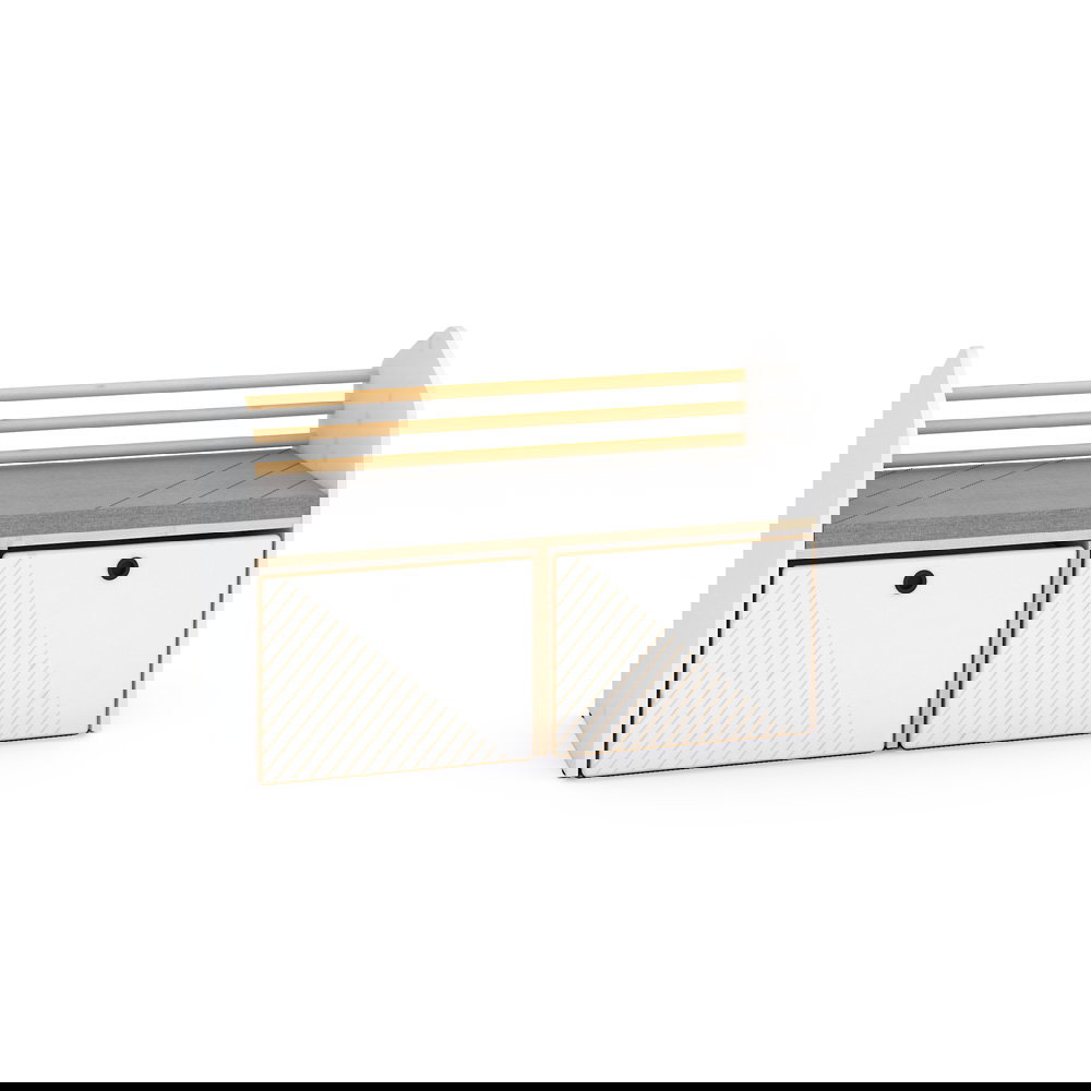 Das Design fügt sich harmonisch in die moderne Ästhetik der Serie ein: Der Korpus in warmem Ahorn-Dekor wird von klaren weißen oder anthrazitfarbenen Seitenwänden flankiert. Ein besonderer Blickfang sind die Rückenlehnen aus massiven Holzrundstäben, die der Bank eine luftige Leichtigkeit verleihen und gleichzeitig stabilen Halt bieten. Unter der bequem gepolsterten Sitzfläche verbergen sich zwei geräumige Rollbehälter. Diese lassen sich dank der kreisrunden Griffmulden kinderleicht hervorziehen und sind der ideale Ort für alles, was schnell zur Hand sein muss, aber nicht herumliegen soll – von Spielsachen über Hausschuhe bis hin zu Bastelmaterialien.