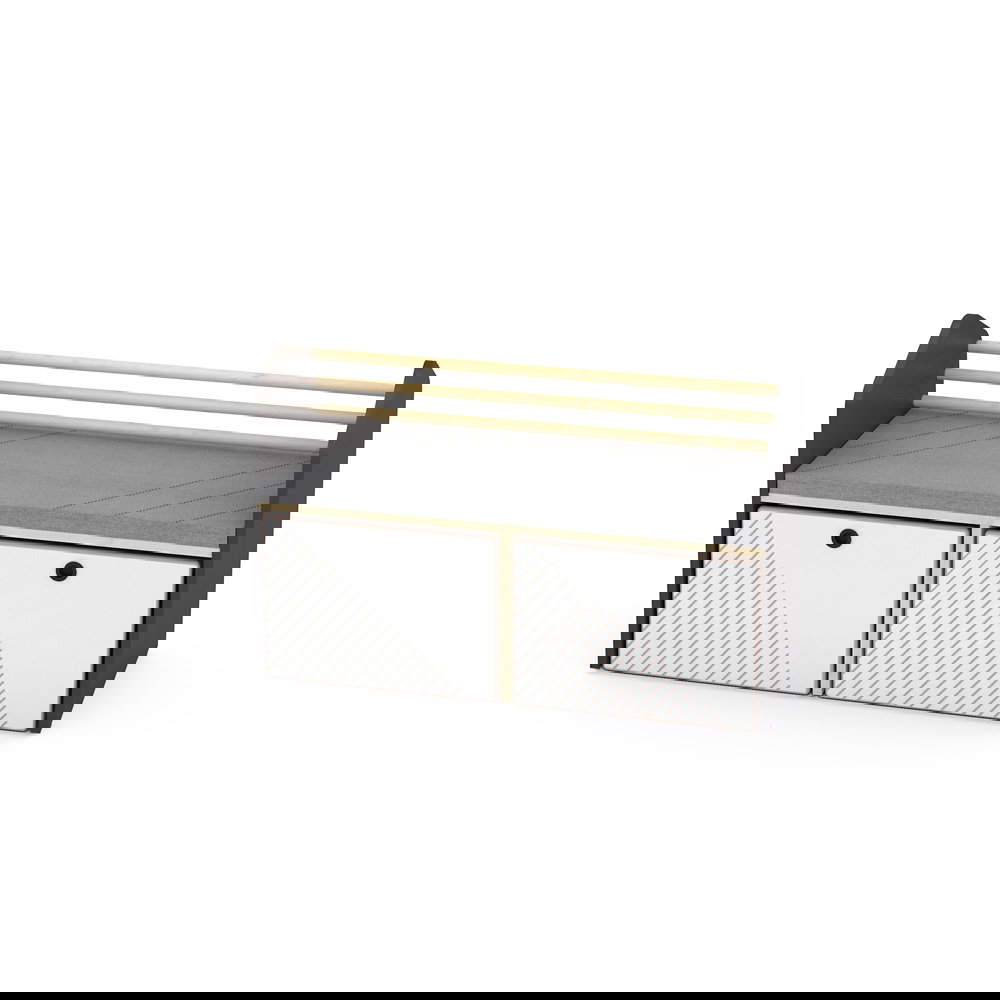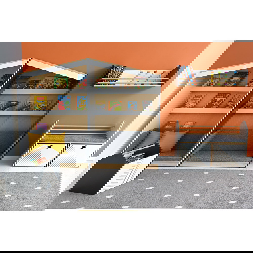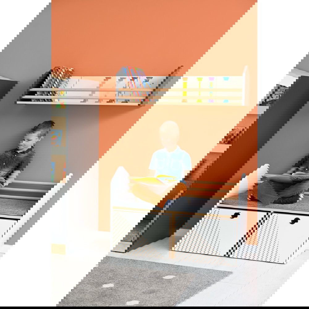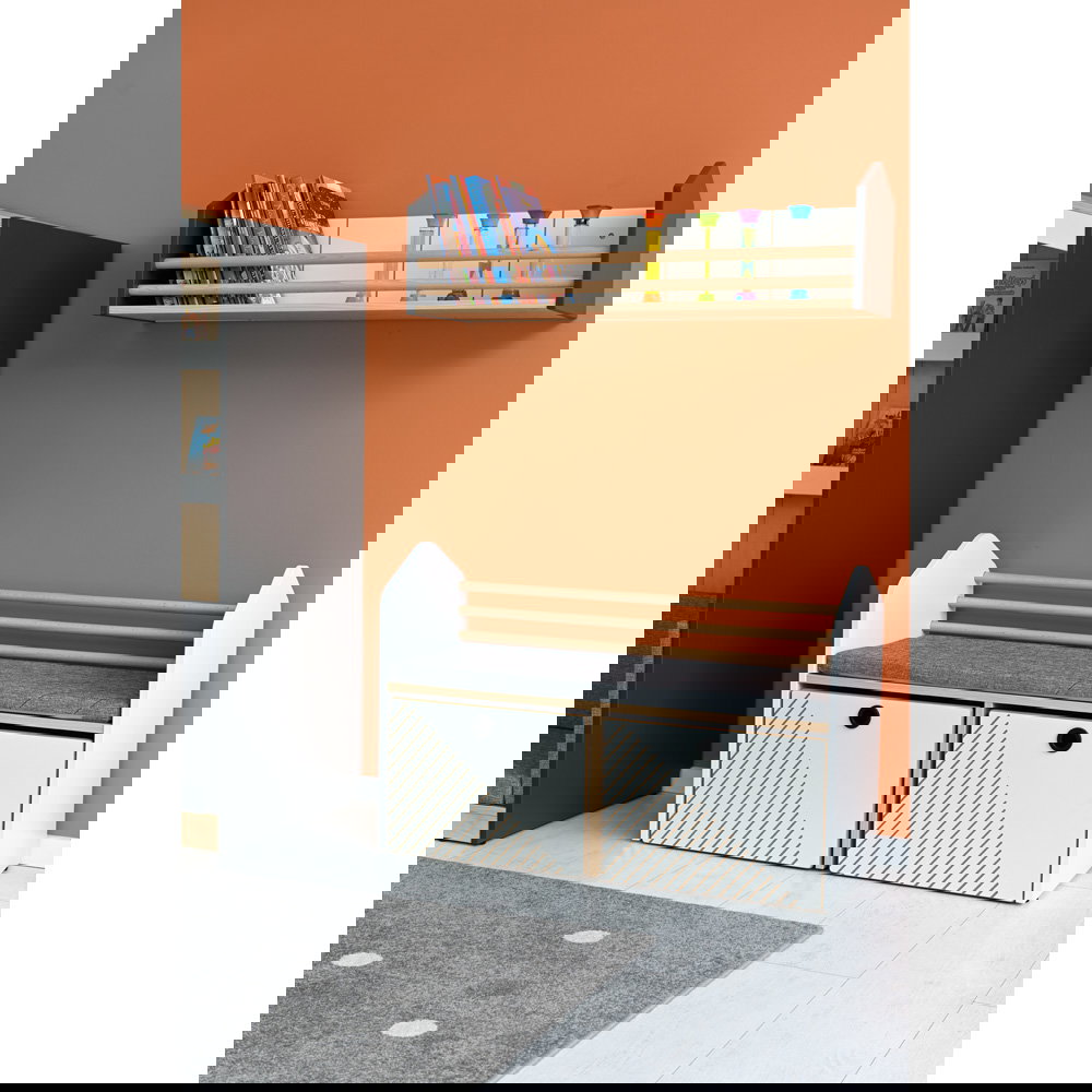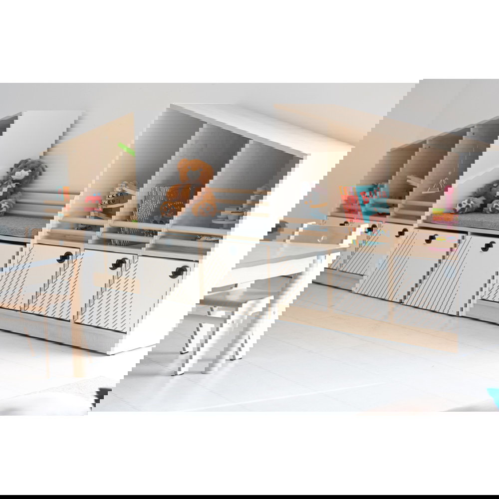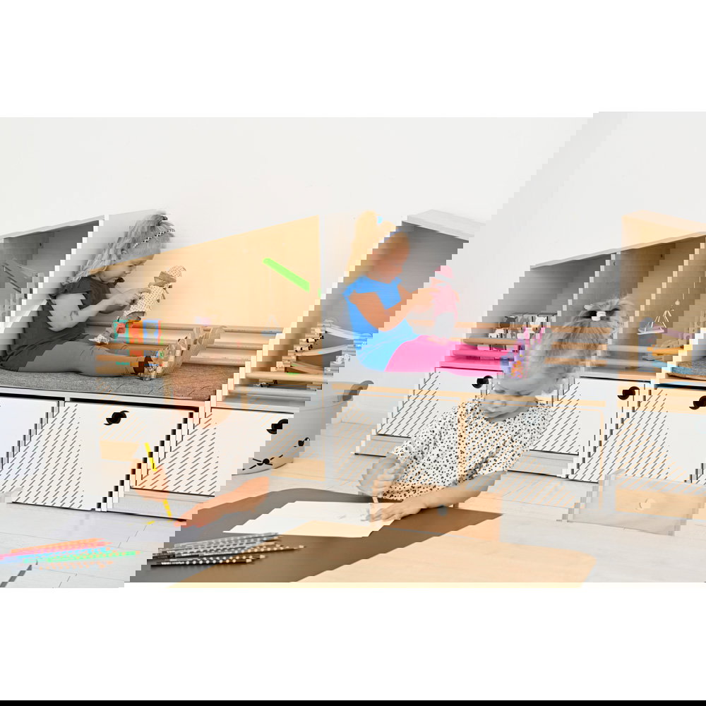 Im Alltag mit Kindern muss es praktisch sein. Der Textilbezug der Polsterung ist schmutz- und wasserabweisend, sodass kleine Missgeschicke schnell beseitigt sind. Auch die laminierten Oberflächen der Bank und der Containerfronten sind widerstandsfähig und leicht zu reinigen. - Sicheres und kindgerechtes Design