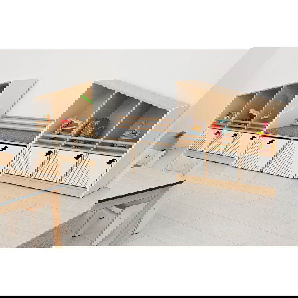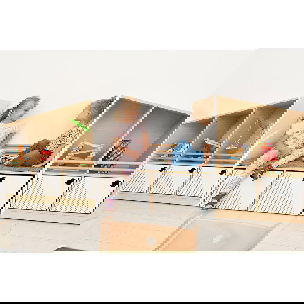In aktiven Spiel- und Lernumgebungen ist Flexibilität der Schlüssel. Kinder brauchen Orte, an denen sie kurz verschnaufen, Schuhe wechseln oder sich mit Freunden austauschen können. Gleichzeitig ist Stauraum immer Mangelware. die FLO Sitzbank mit Rollbehältern löst beide Herausforderungen mit Eleganz und Raffinesse. Als cleveres Multitalent der FLO-Kollektion verbindet sie eine bequeme Sitzgelegenheit mit großzügigem, mobilem Stauraum.