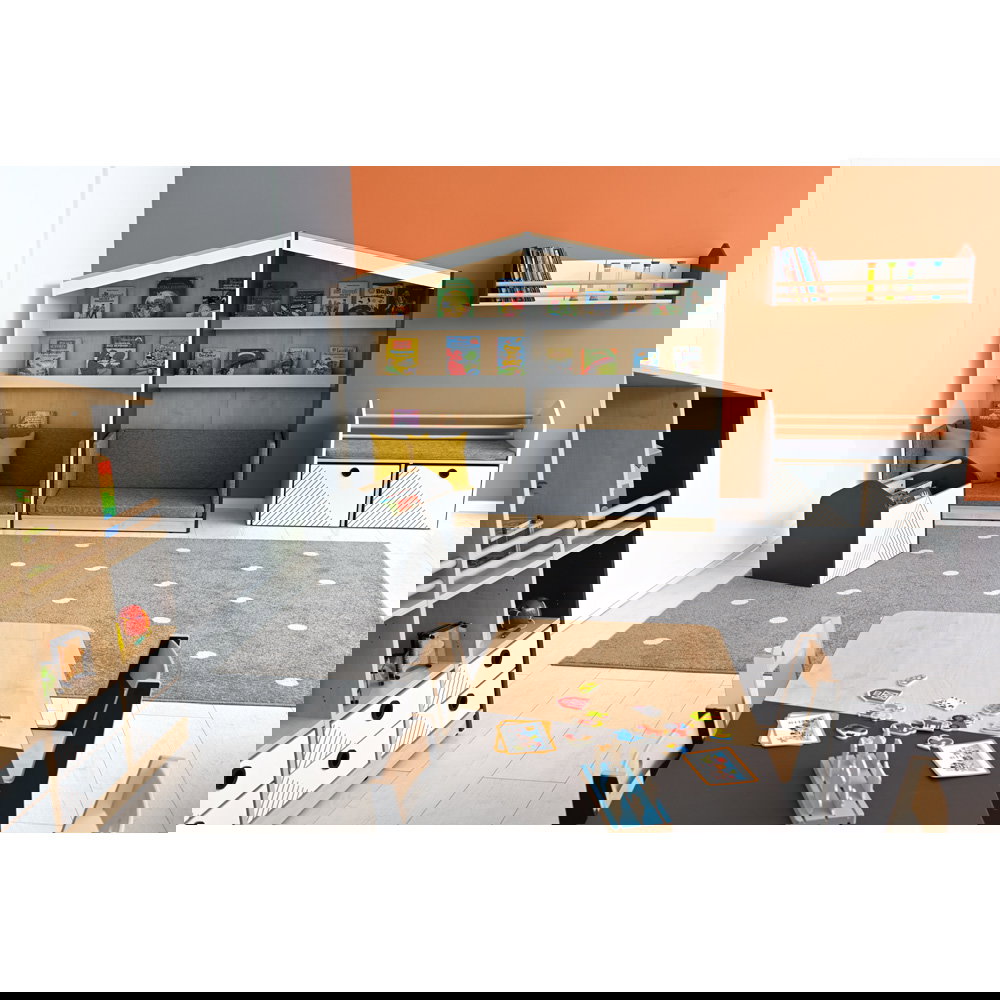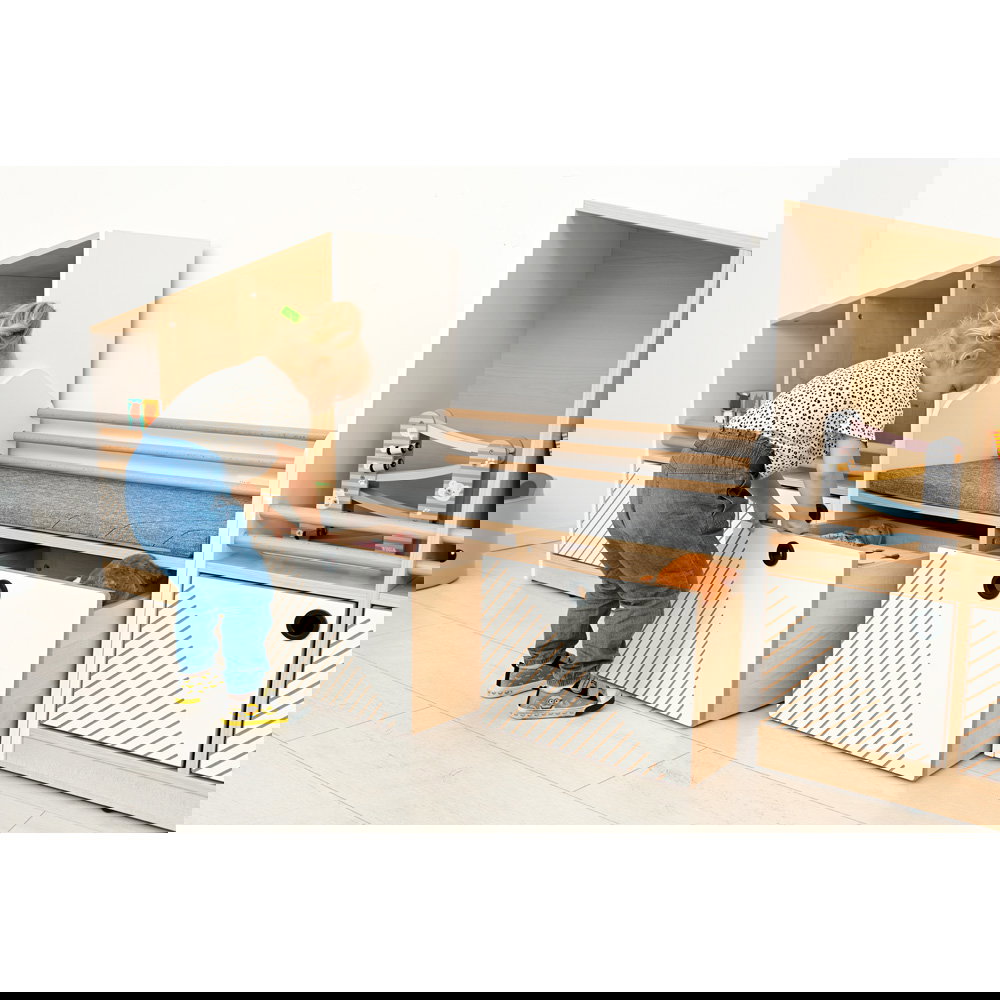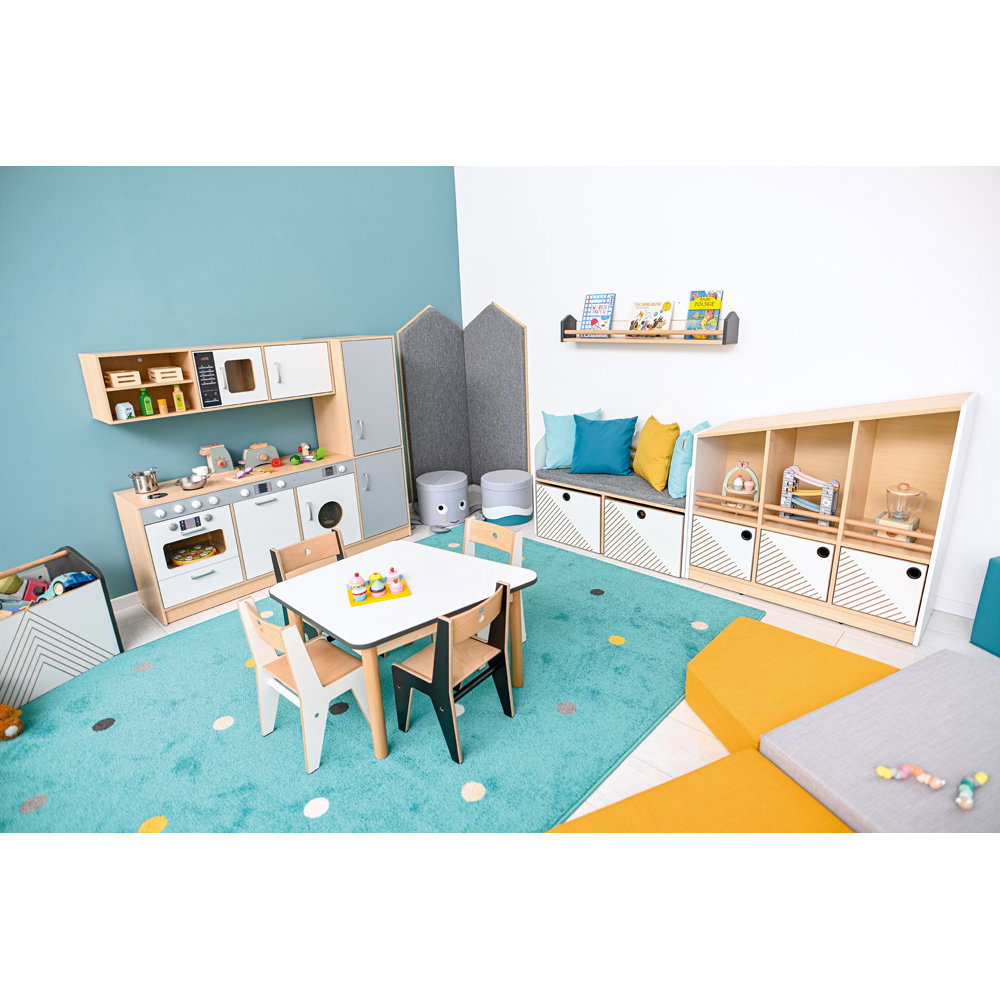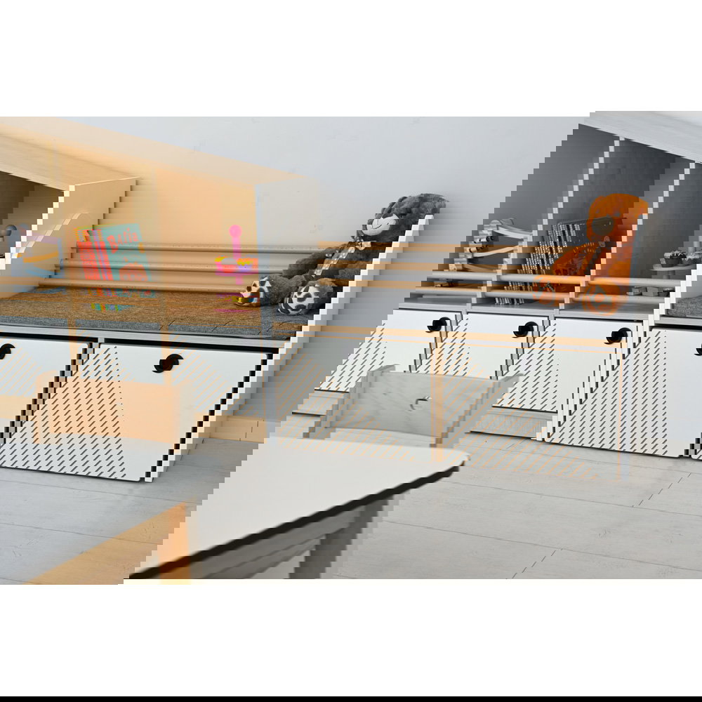 Die zwei integrierten Rollcontainer sind wahre Raumwunder. Sie nutzen den Platz unter der Sitzfläche effizient aus und sind dank ihrer Rollen mobil einsetzbar. Kinder können die Kisten einfach dorthin ziehen, wo sie gerade spielen, und am Ende des Tages alles schnell wieder unter der Bank „einparken“. - Pflegeleicht und robust