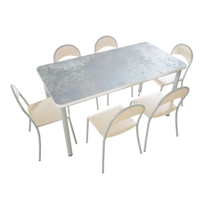 Tisch und Stühle hergestellt nach DIN EN 1729. Tischbeine umweltschonend lackiert mit Acryllack auf Wasserbasis. Keine störenden oder gesundheitsschädlichen Ausdünstungen von Anfang an. Bei starker mechanischer Beanspruchung kann es jedoch schneller zu Abnutzungserscheinungen am Lack kommen. Dies stellt keinen Mangel dar. ACHTUNG: Verwenden Sie für die Pflege keine alkoholhaltigen Mittel oder starke Desinfektionsmittel.