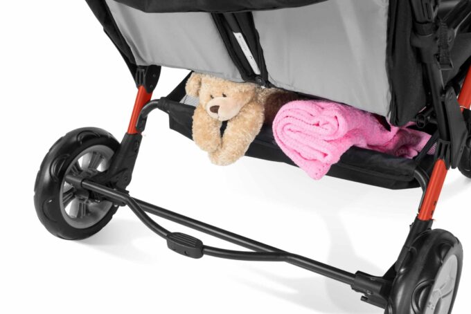 Hochleistungsräder aus Gummi bieten den gleichen stoßdämpfenden Komfort wie luftgefüllte Räder. Eine fußaktivierte Bremse sichert den Kinderwagen beim Parken. Der hintere Stauraum bietet Platz für das Nötigste. Überdachungen schützen vor schlechtem Wetter und UV-Strahlen und genießen die Fahrt im Freien. Der ideale Kinderwagen.