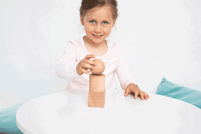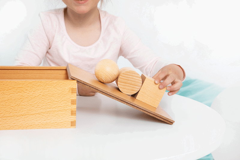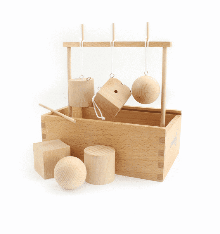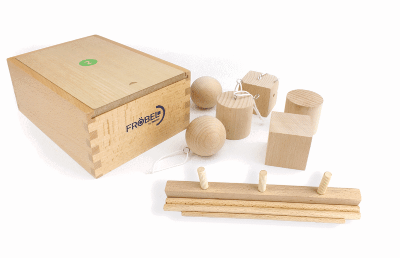Das erste Spielzeug eines Kindes ist nach Fröbel der Ball. Mit der „Spielgabe“ 1, den sechs Wollbällen, wird das kindliche Interesse durch Bewegung geweckt. Mit dem Ball kann das Kind in die Welt der Bewegung hineinfinden. Durch den Nachahmungstrieb inspiriert, kann es die eigene Geschicklichkeit entwickeln. Die 2. „Spielgabe“ – die berühmteste von Fröbel – enthält eine Kugel, eine Walze und einen Würfel. Es geht darum die schiefe Ebene und die Eigenschaften dieser drei Figuren spielerisch kennenzulernen. Die Bausteine laden die Kinder zum Experimentieren ein.