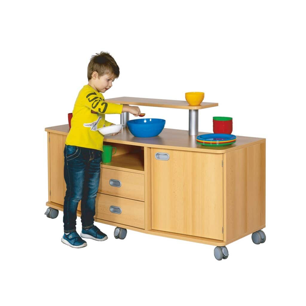 Machen Sie das tägliche Frühstück und die Brotzeit zu einem organisierten und einladenden Erlebnis! Unsere fahrbare Frühstückstheke ist die mobile Komplettlösung, die Ordnung, Funktionalität und Stil in den Essensalltag von Kitas, Kindergärten und Grundschulen bringt. Entwickelt, um alle Utensilien für eine gelungene Mahlzeit zentral an einem Ort zu bündeln und flexibel dorthin zu bringen, wo sie gebraucht werden, verwandelt dieser Wagen jede Mahlzeit in ein unkompliziertes Highlight. Mit großzügigem Stauraum, einer durchdachten Aufteilung und einem praktischen Thekenaufsatz wird das Verteilen von Tellern, Bechern und Leckereien zum Kinderspiel. Entdecken Sie, wie einfach es sein kann, den Service zu optimieren und eine entspannte Atmosphäre zu schaffen – für einen genussvollen Start in den Tag.