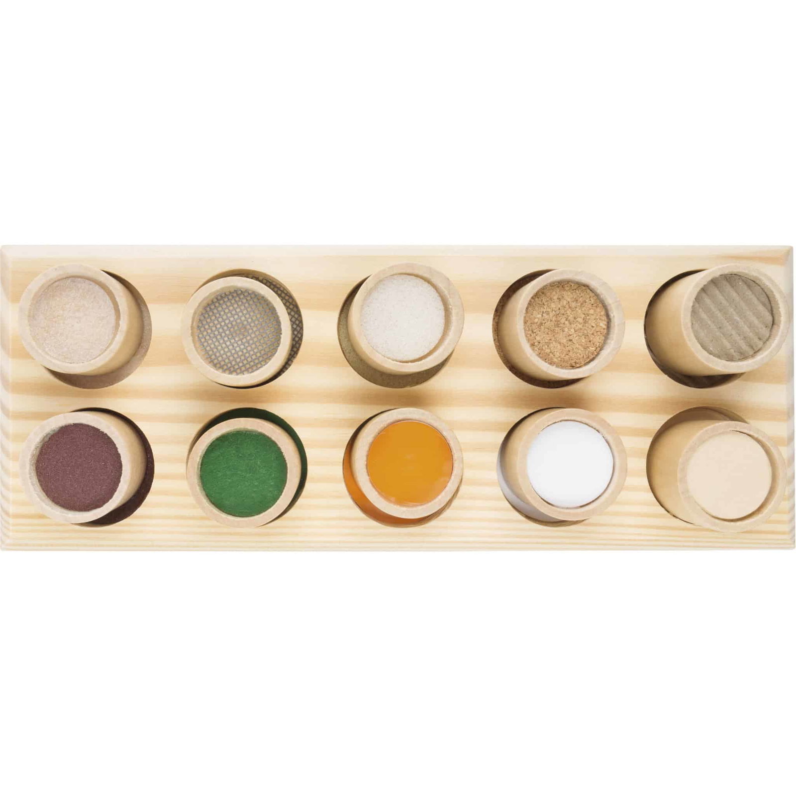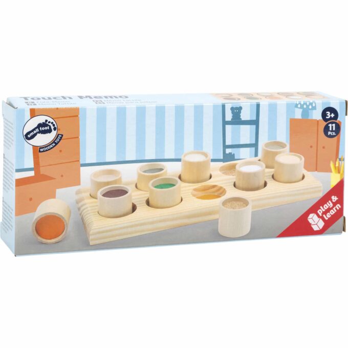 Das Fühl-Memo fordert die Kinder heraus, verschiedene Oberflächen durch Tasten zu erkennen. Ziel des Spiels ist es, die passenden Materialien auf den Zylindern und dem Zuordnungsbrett zu finden und ihnen die richtigen Paare zuzuordnen – ganz ohne den Einsatz des Sehsinns. Dies fördert nicht nur den Tastsinn, sondern auch das Bewusstsein für unterschiedliche Texturen und Materialien.