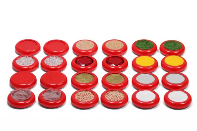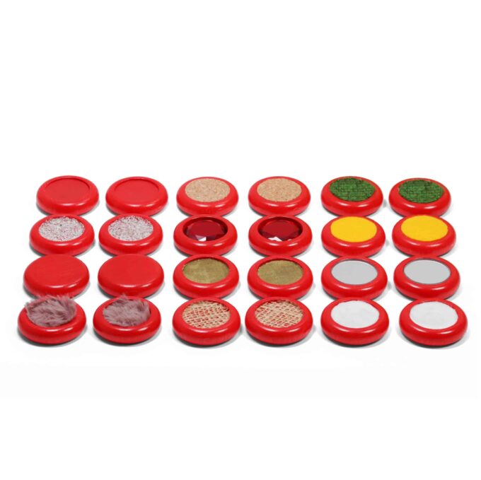 Die Fühl-Scheiben greifen das klassische Memo-Prinzip auf und erweitern es. Die Kinder können ihre Gedächtnisleistung trainieren und gleichzeitig ihre sprachlichen Fähigkeiten entwickeln. Wenn die Scheiben mit der fühlbaren Seite nach unten auf dem Tisch liegen, dürfen die Kinder nacheinander alle Scheiben ertasten. Dabei entwickeln sie ein Gespür für die verschiedenen Texturen, Formen und Oberflächen.