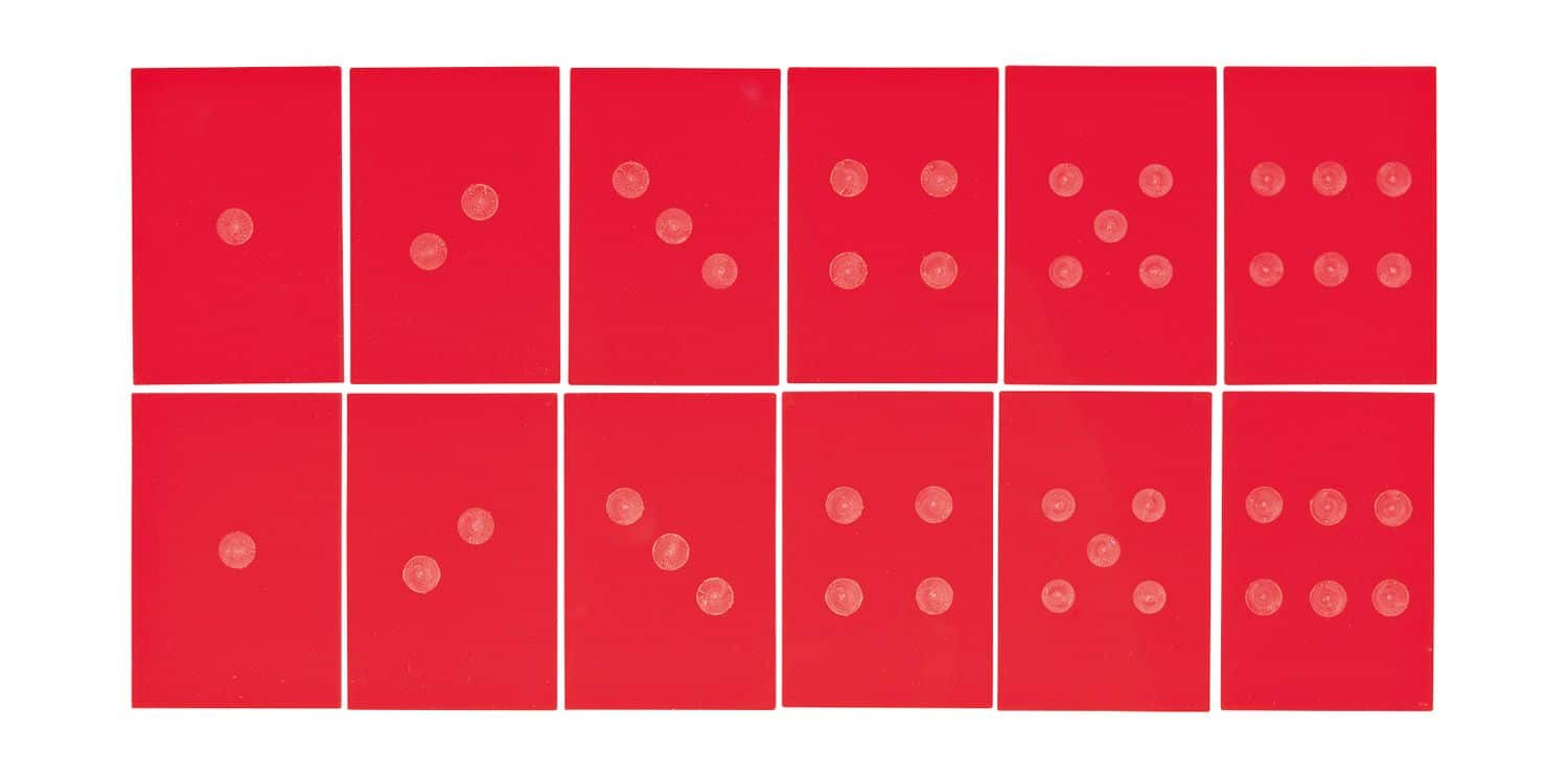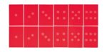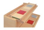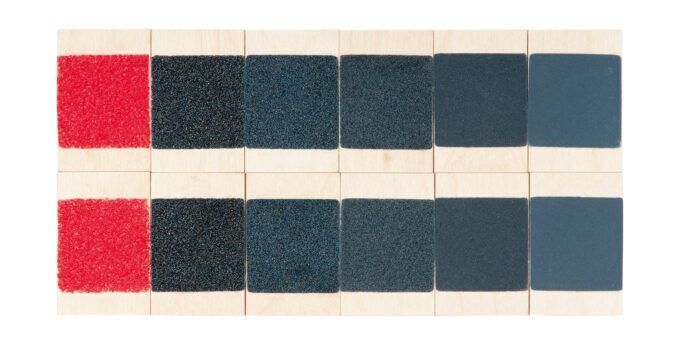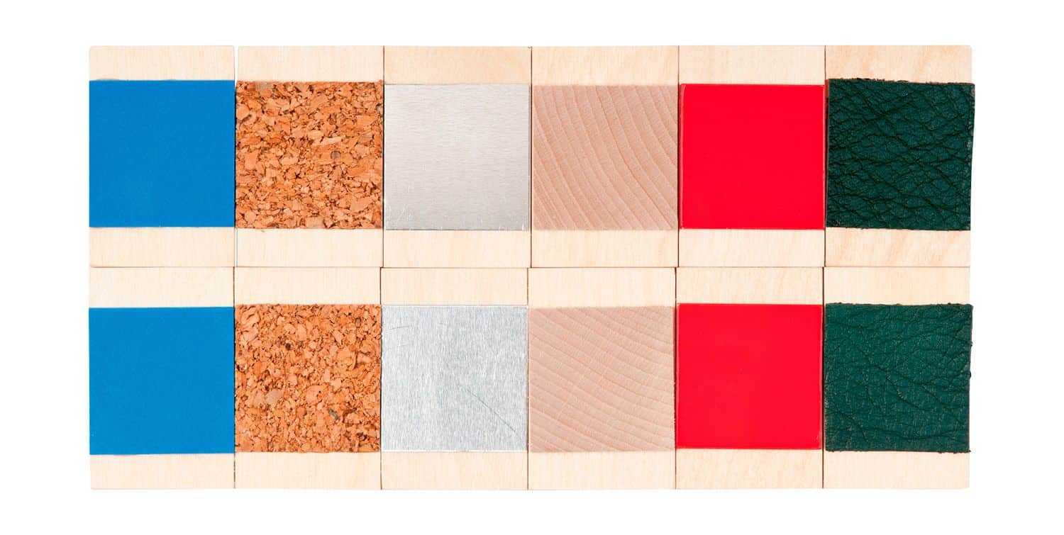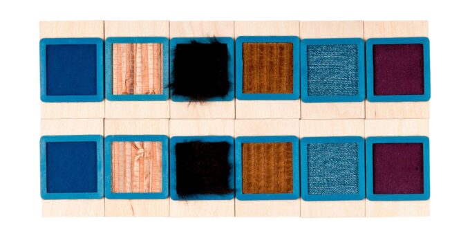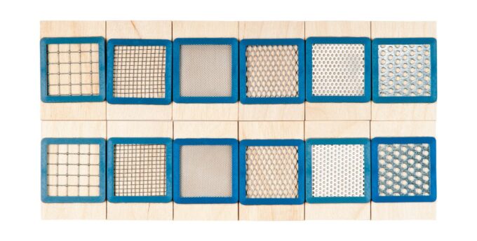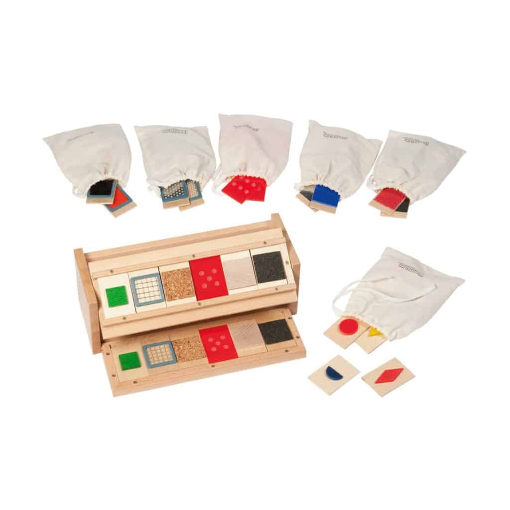 - 6 Sets von Plättchen mit je 6 Materialpaaren (Textilstrukturen, Würfelaugen, Sandpapier, Gitterstrukturen, Geoformen, glatte Oberflächen)
