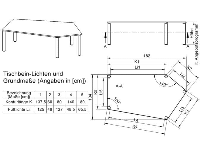- Tischplatte: 184 × 104 cm (fünfeckig)