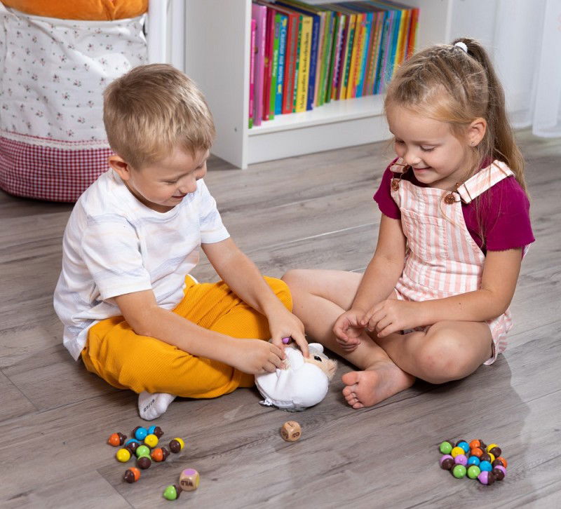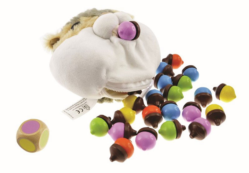 - Farben und Zahlen lernen: Durch die farbigen Holzwürfel lernen Kinder spielerisch, Farben zu erkennen, zu benennen und zuzuordnen. Auch erstes Zählen wird gefördert, wenn es darum geht, die Anzahl der zu fütternden Eicheln zu bestimmen.