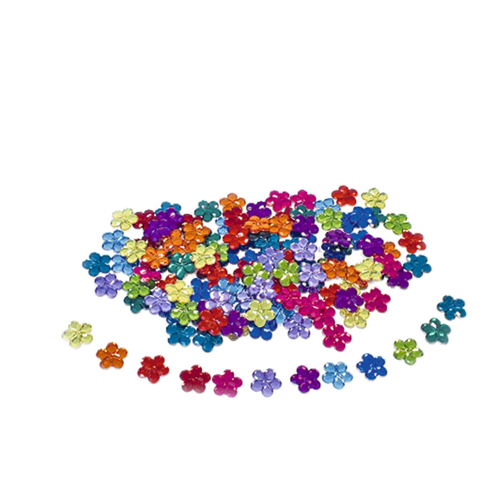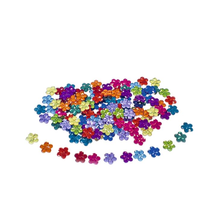 - Art. 3135 – Blumen-Funkelsteine glänzend: 120 Teile in 12 leuchtenden Farben, Durchmesser: 2,5 cm.