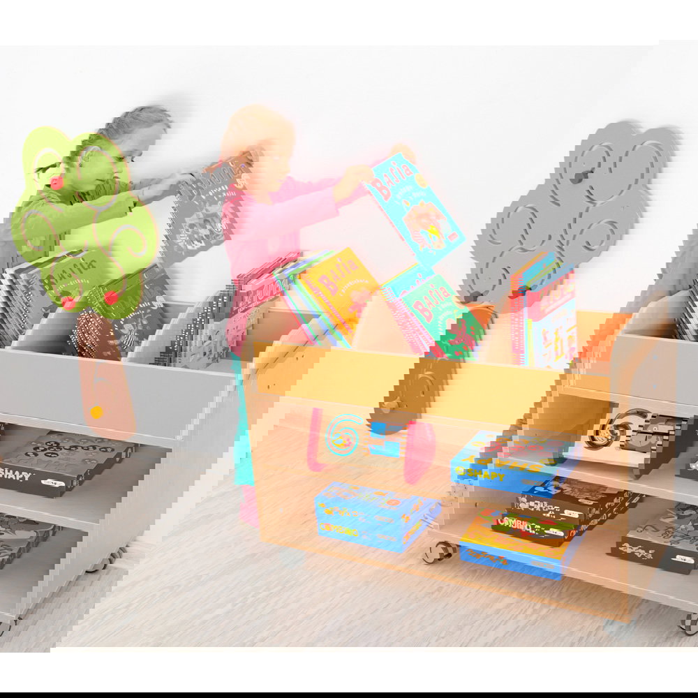 Die Konstruktion und Handhabung sind ganz auf den anspruchsvollen Alltag in Bildungseinrichtungen ausgerichtet. Mit wenigen beiliegenden Schrauben befestigen Sie den Aufsatz sicher und fest auf dem jeweiligen Basisregal. Das Ergebnis ist eine stabile, kippsichere Einheit, die auch einer intensiven Nutzung problemlos standhält. Gefertigt aus robustem lackiertem Sperrholz und ergänzt durch stabile Elemente aus anderen Materialien, bietet das Regal eine dauerhafte und belastbare Lösung für Bilderbücher, Vorlesegeschichten und Sachbücher unterschiedlichster Formate. Durch die angenehme Höhe haben die Kinder ihre Lieblingsgeschichten stets auf Augenhöhe und können diese selbstständig entnehmen und wieder aufräumen.