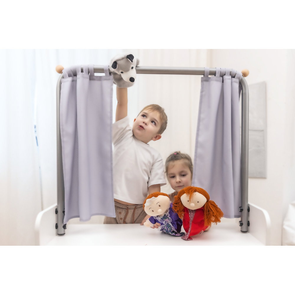 Dieser vielseitige Aufsatz besticht durch seine simple, aber geniale Konstruktion. Er besteht aus einem robusten Metallgestell, das mit zwei eleganten, grauen Vorhängen ausgestattet ist. Je nach Spielidee lässt sich die Bühne öffnen und schließen oder der Kaufladen für die Kundschaft freigeben. Die Montage ist kinderleicht: Der Aufsatz wird passgenau für die mobilen Regale unserer beliebten Kollektionen Flexi, Echtholz und Quadro gefertigt und einfach mit Schrauben sicher auf dem Basiselement befestigt. So entsteht eine stabile und langlebige Einheit, die dem lebhaften Spielalltag in Kitas, Schulen oder im heimischen Kinderzimmer problemlos standhält.