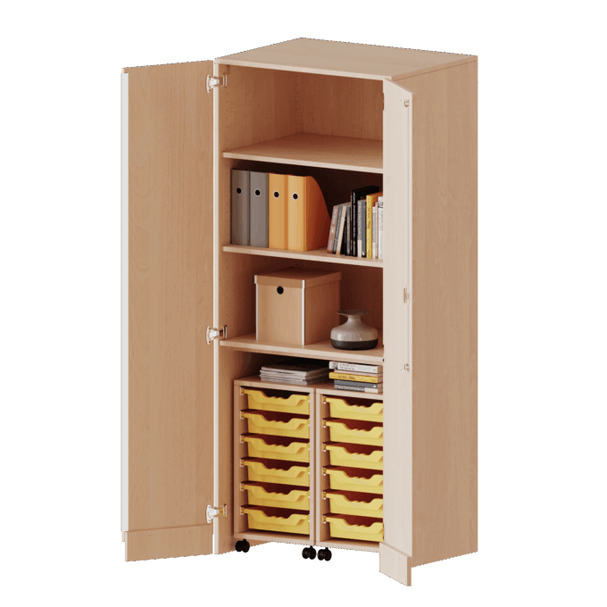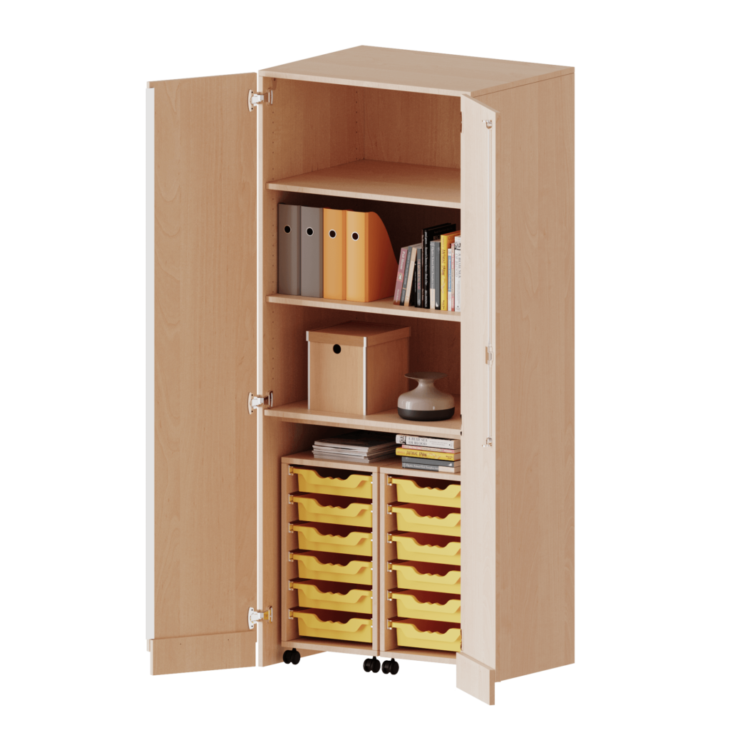 - Zwei mobile Materialwagen inklusive: Das Herzstück des Schranks sind die beiden herausnehmbaren Rollcontainer. Jeder ist mit sechs flachen ErgoTray-Boxen bestückt, ideal für die Feinsortierung von Stiften, Arbeitsblättern und Bastelmaterial.