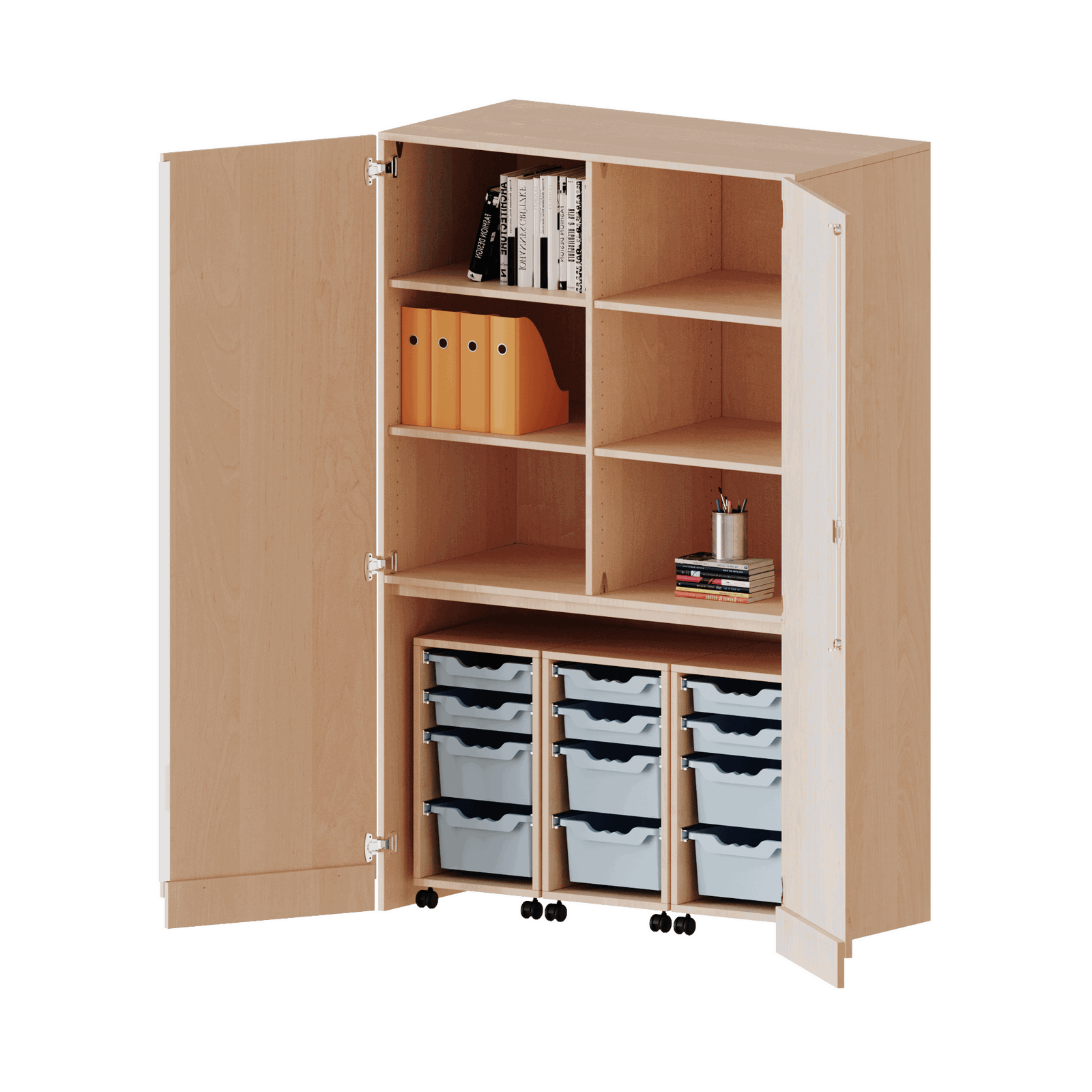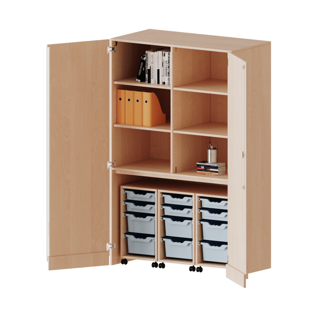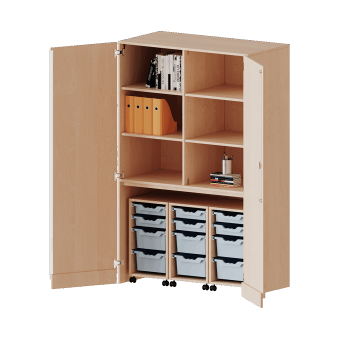 Entdecken Sie das flexibelste Organisationssystem für dynamische Lernlandschaften: den breiten Garagenschrank der Serie evo180. Dieses einzigartige System kombiniert die Sicherheit eines hohen, abschließbaren Schranks mit der unschlagbaren Mobilität von drei Rollcontainern, die für gemischte Materialien optimiert sind. Während im oberen Bereich auf drei Ordnerhöhen klassische Utensilien in sechs Fächern Platz finden, parken darunter drei wendige Container mit insgesamt 6 flachen und 6 hohen ErgoTray-Boxen. Rollen Sie Materialien jeder Größe für ganze Gruppen dorthin, wo sie gebraucht werden, und schließen Sie am Ende des Tages alles sicher weg.