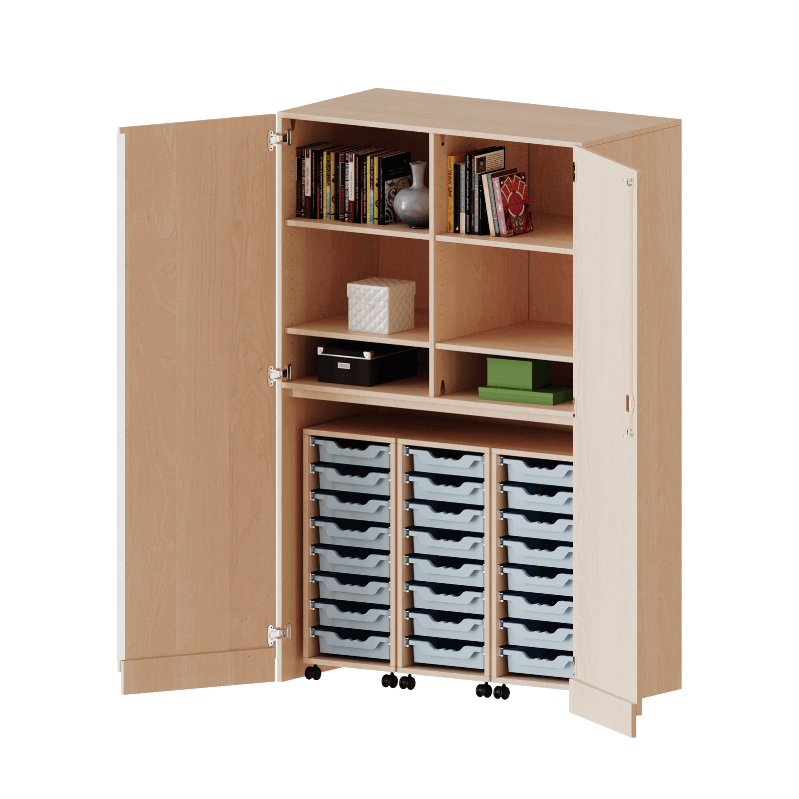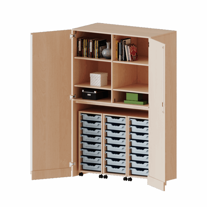 - Drei mobile Materialwagen für beispiellose Feinsortierung: Das Herzstück des Schranks sind die drei herausnehmbaren Rollcontainer. Jeder ist mit acht flachen ErgoTray-Boxen bestückt, was insgesamt 24 Boxen für eine personalisierte Zuteilung von Stiften, Arbeitsblättern und Bastelmaterial ergibt – perfekt für die Organisation ganzer Klassen.