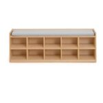 Das Shoe Regal ist mit 10 Fächern ausgestattet, die jeweils Platz für die Hausschuhe und Straßenschuhe der Kinder bieten. So bleibt alles ordentlich und die Kinder lernen, ihre Sachen selbstständig zu organisieren. Das Schuhregal hat die Maße 120 x 30 x 54 cm und bietet ausreichend Komfort dank der bequemen Sitzfläche und des hochwertigen PU-Schaumstoffkissen mit einem beschützenden Bezug aus Baumwoll-Mischgewebe.