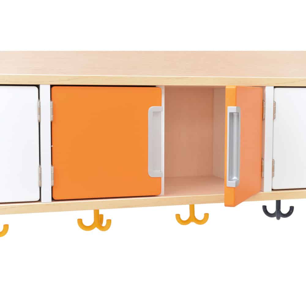 Die Garderobe kann mit passenden Türen in einer Vielzahl von lebhaften Farben (Artikelnummern 095457-095468, separat bestellbar) ergänzt werden, um einen individuellen Look zu kreieren. Zusätzlich sind farbige Haken (092530-092533, 255100-255102) und eine Rückenlehne zum Nachrüsten (096107, 096114) ebenfalls separat erhältlich.