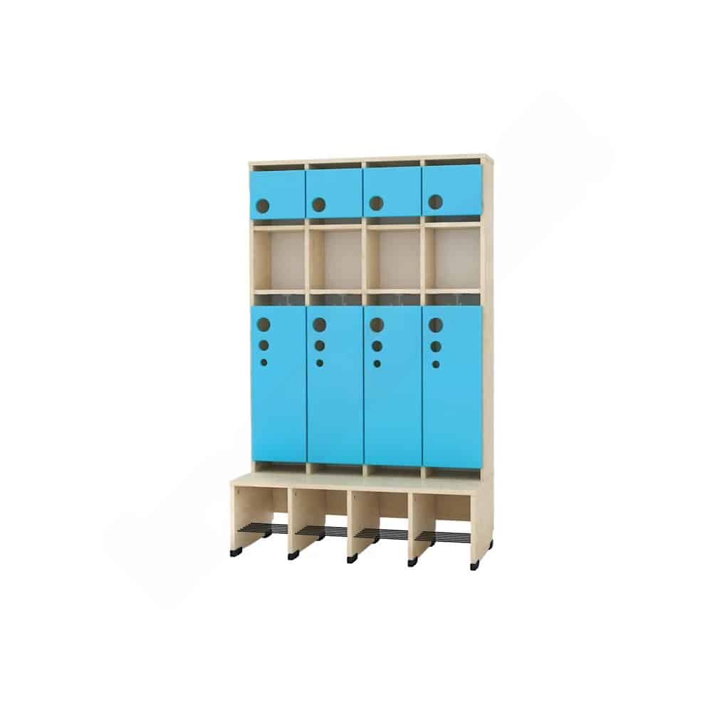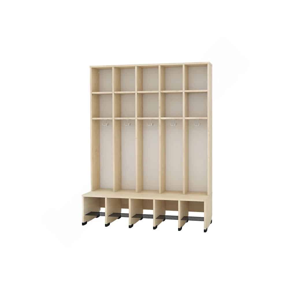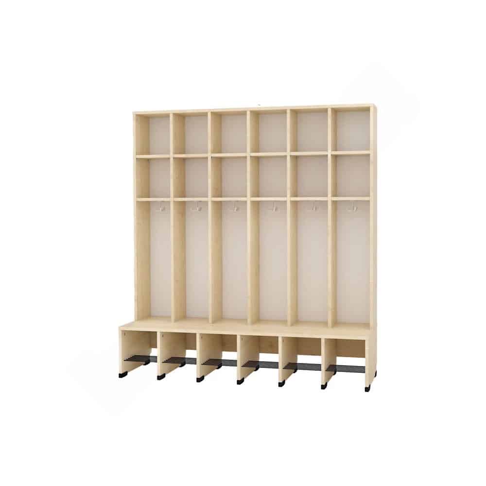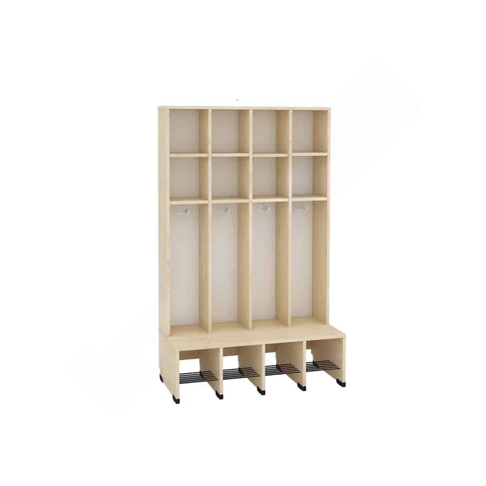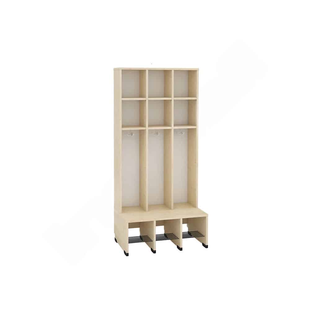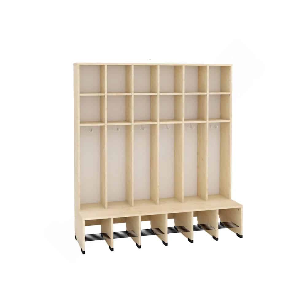 Die Sitzbank erstreckt sich über die gesamte Schrankfläche und verfügt über eine eingebaute Schuhablage mit Gitterrost, die für eine optimale Belüftung sorgt. Mit einer doppelten Mützenablage ausgestattet, finden Mützen, Schals und andere wichtige Accessoires ihren Platz.